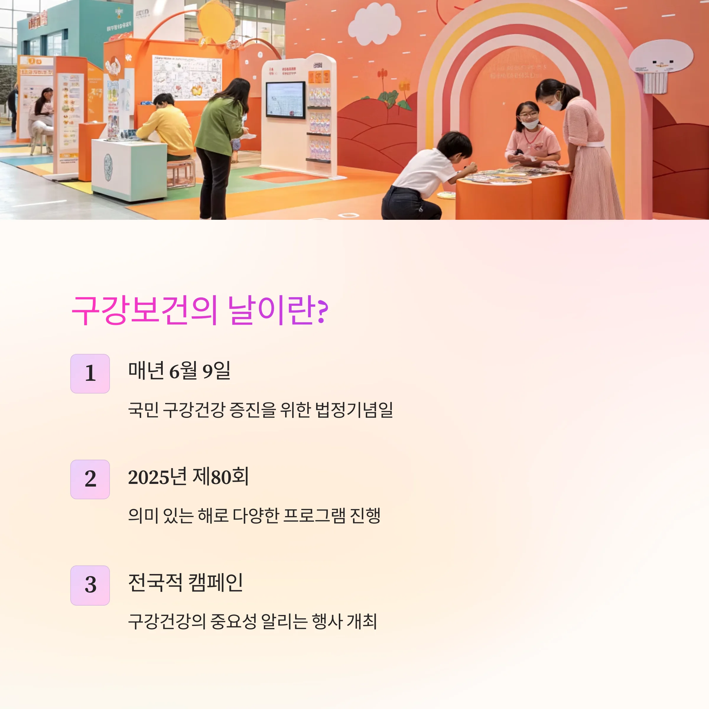 | 매년 6월 9일, 국민의 구강건강 증진을 위한 법정기념일 | 다양한 체험형 부스와 교육 프로그램으로 구성 | 올바른 칫솔질, 정기적인 치과 검진 등 실천 필요 |