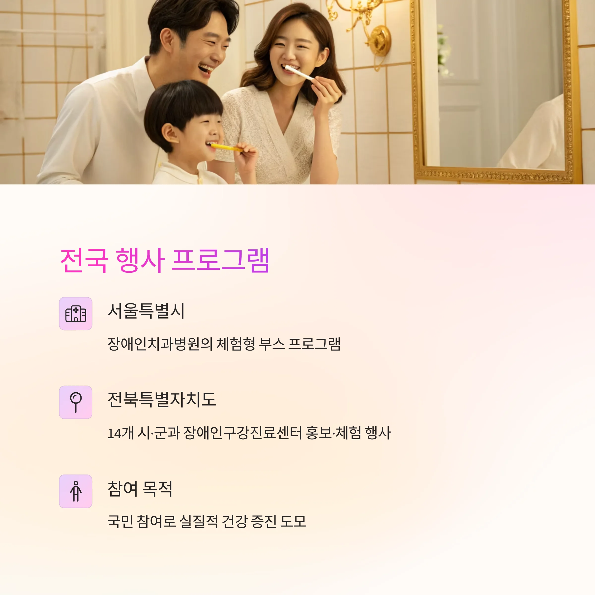 예를 들어, 서울특별시 장애인치과병원은 시민의 구강건강 증진을 위해 다양한 체험형 부스 프로그램을 운영하고 있으며, 전북특별자치도는 도내 14개 시·군과 전북권역 장애인구강진료센터에서 다양한 홍보·체험 행사를 진행하고 있습니다.