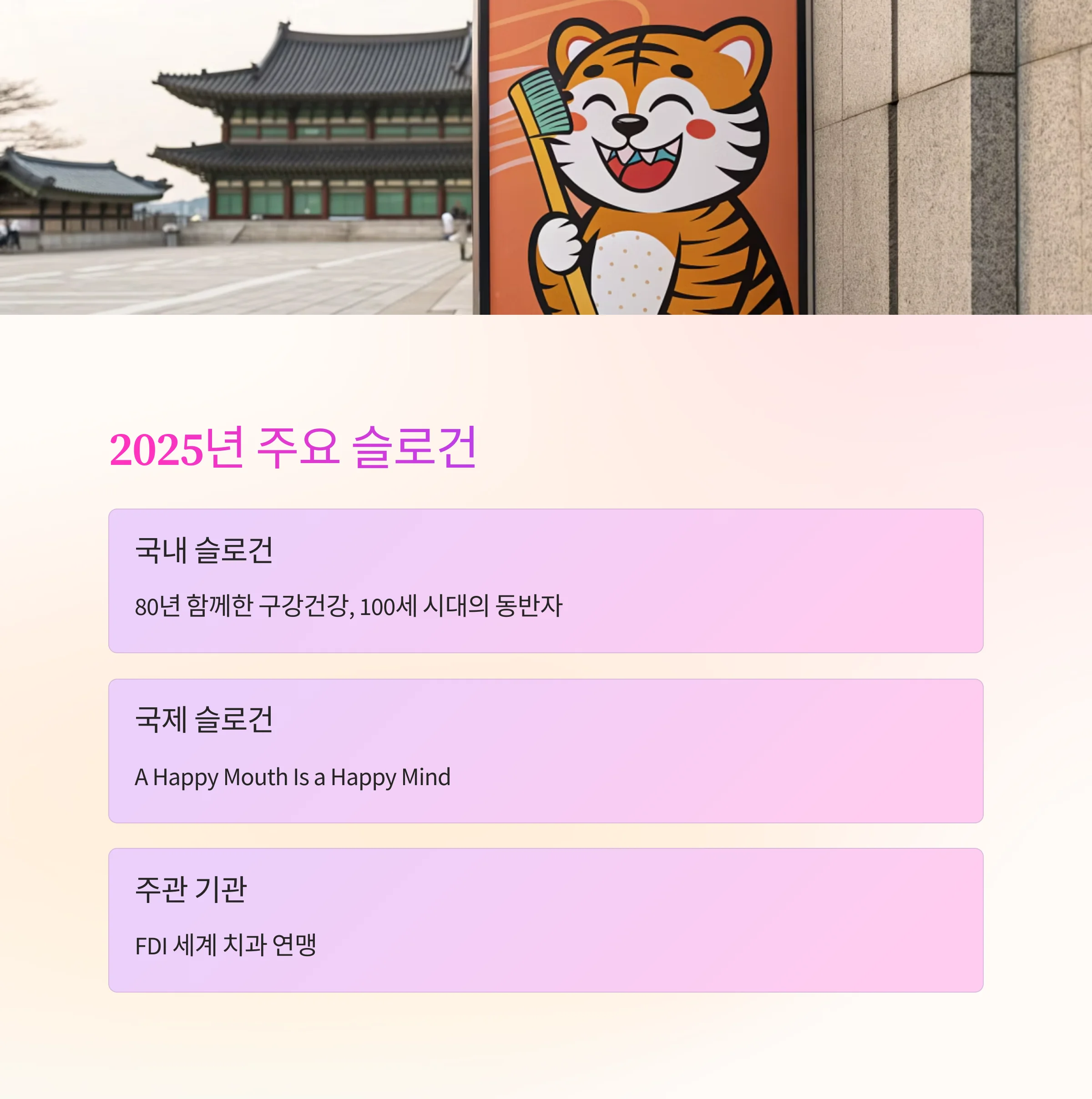 | 2025년 국내 슬로건 | 80년 함께한 구강건강, 100세 시대의 동반자 |