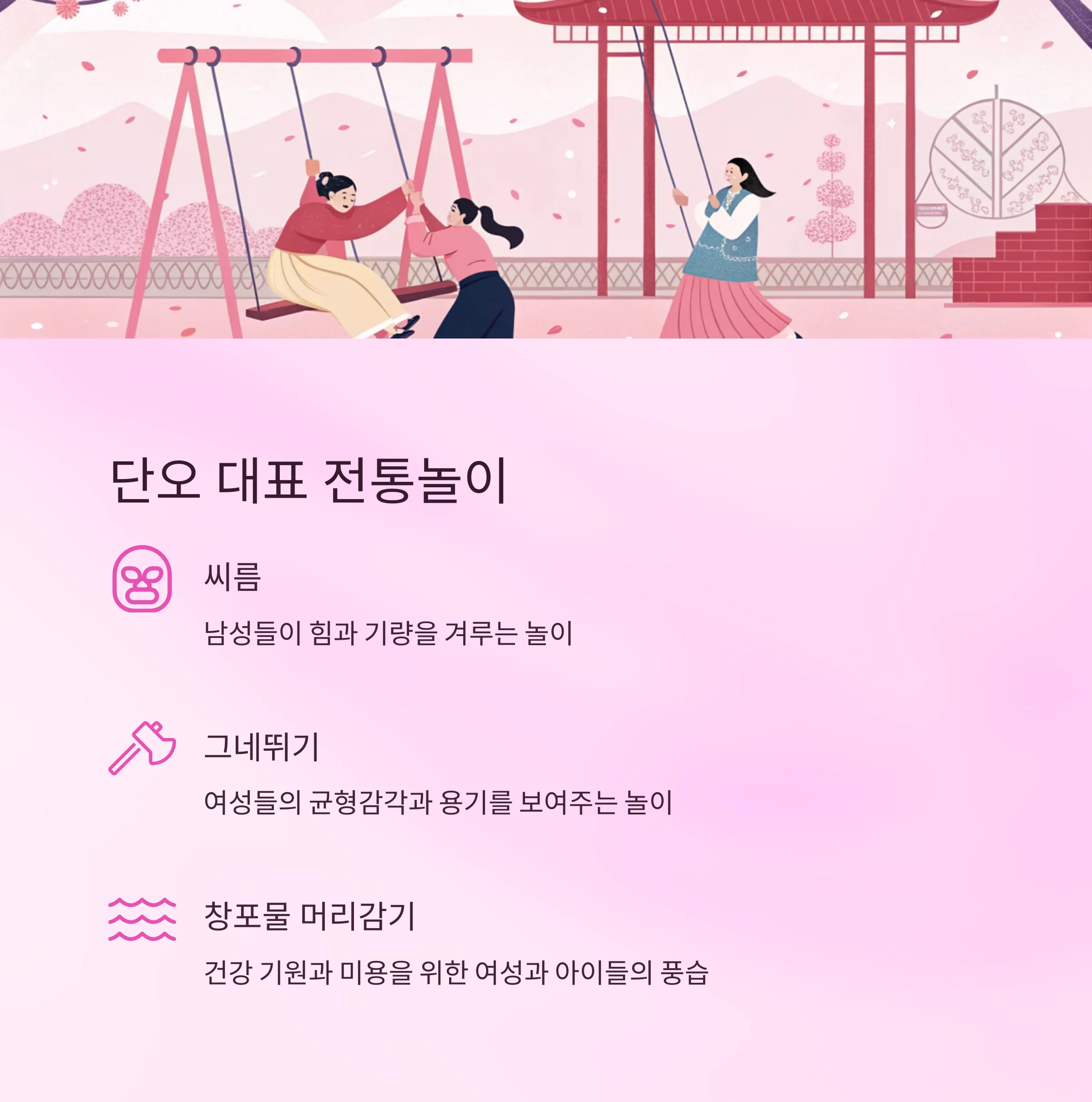 단오는 신체의 정화와 공동체 화합이 중심인 날이기 때문에 이를 반영한 놀이가 많습니다.