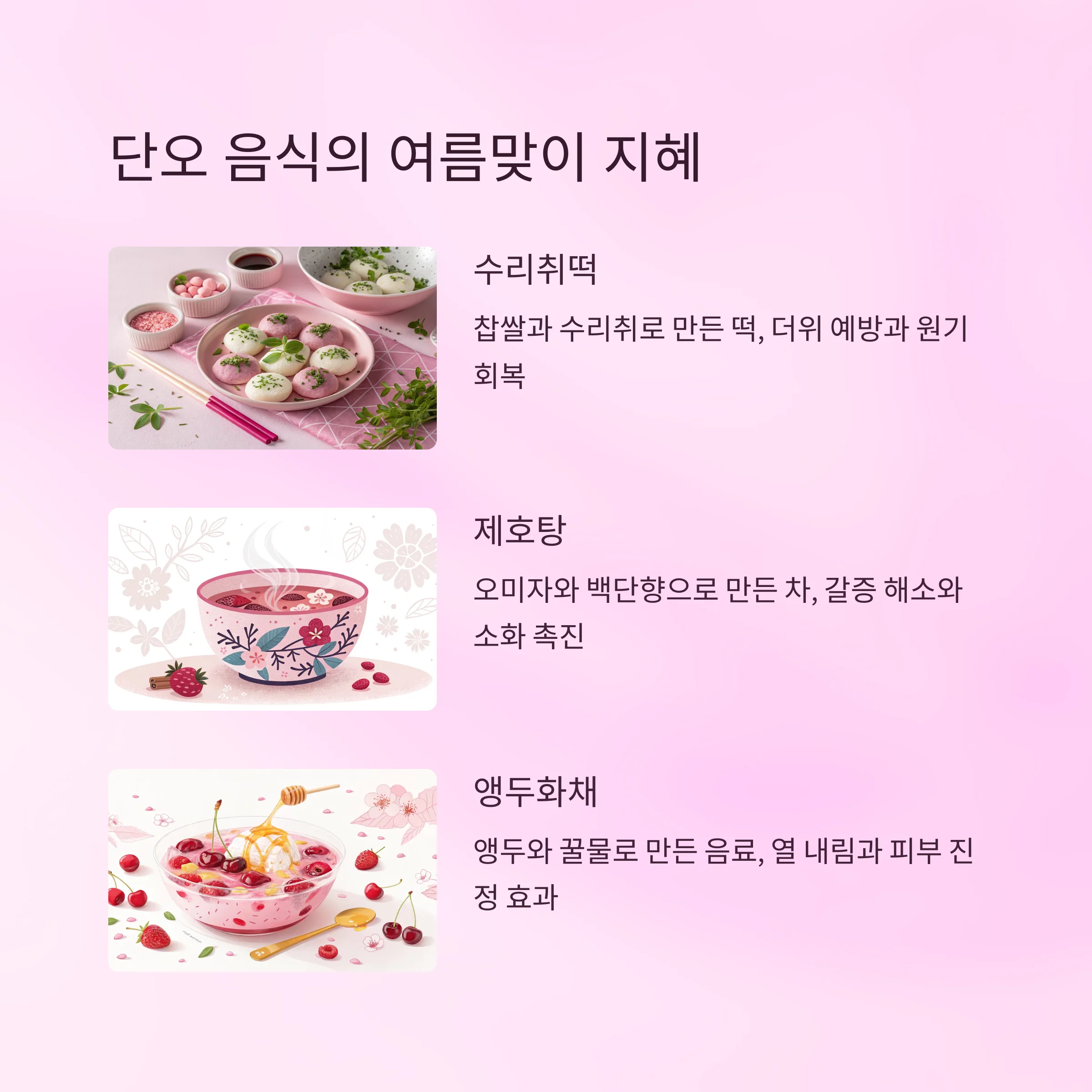대표적인 음식은 수리취떡(또는 단오떡), 제호탕, 앵두화채 등이 있으며 모두 더위 해소와 기력 회복에 초점을 맞춘 것이 특징입니다.
