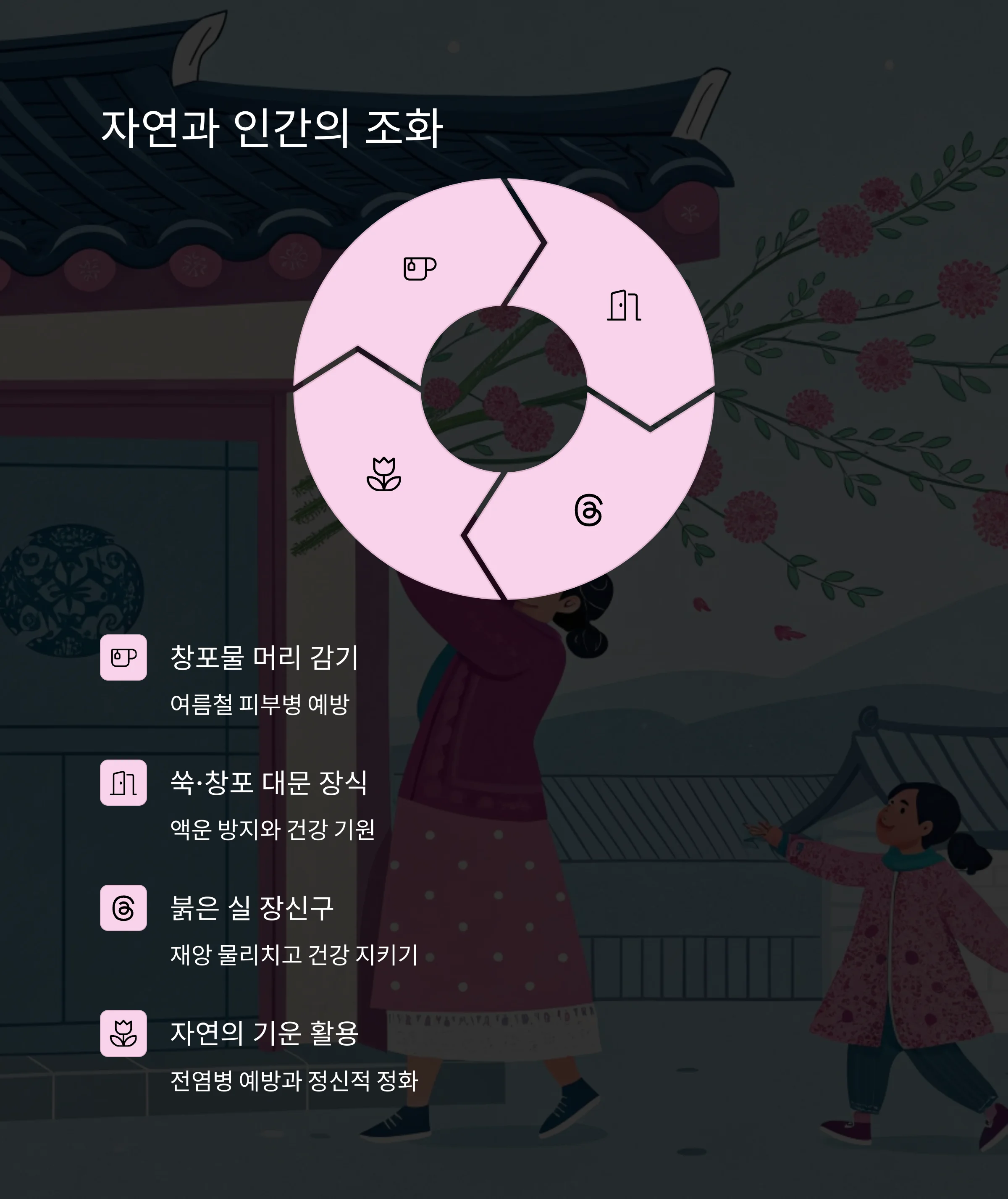 뿐만 아니라, 도시 생활 속에서도 쑥 목욕이나 앵두화채처럼 전통 방식의 여름맞이 건강법을 생활 속에서 실천할 수 있습니다.