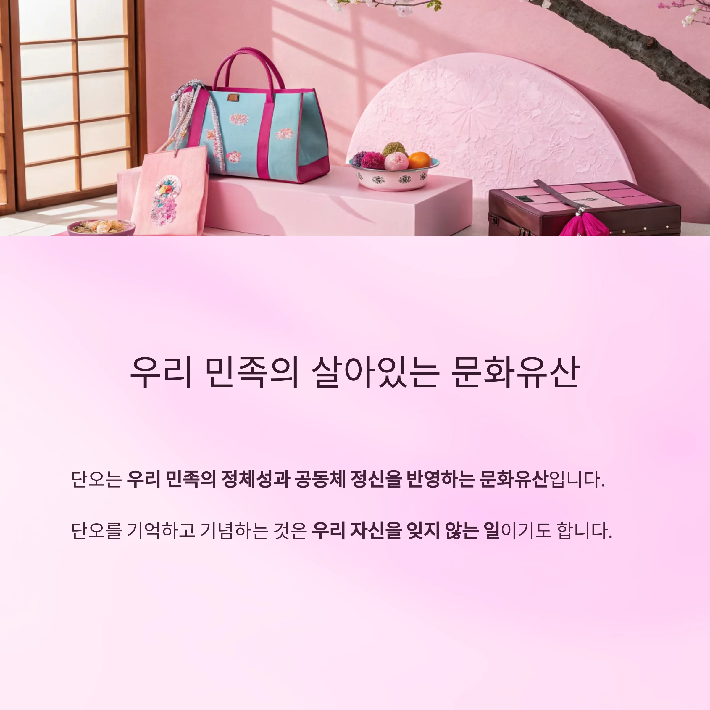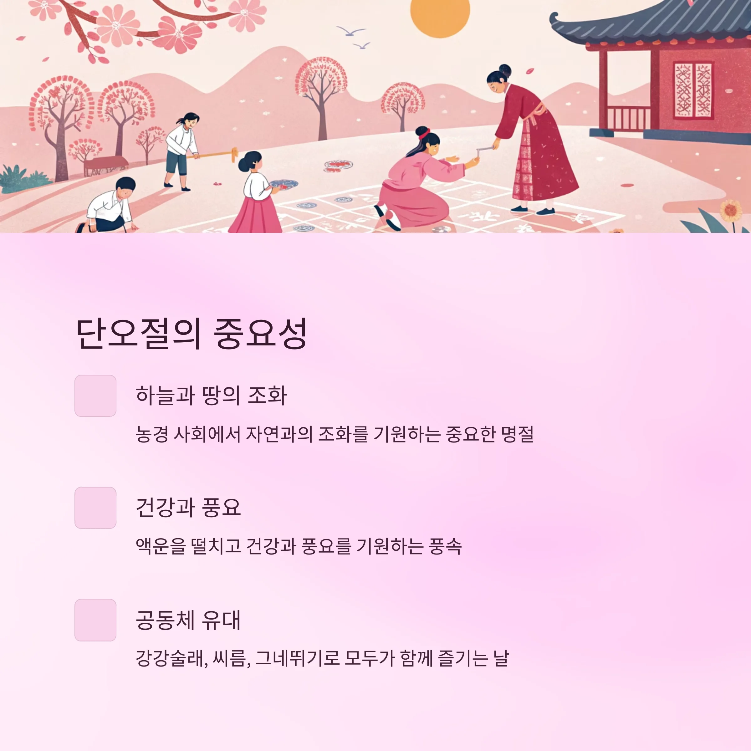 단오는 단순한 명절이 아니라 우리 민족의 정체성과 공동체 정신을 반영하는 문화유산입니다.