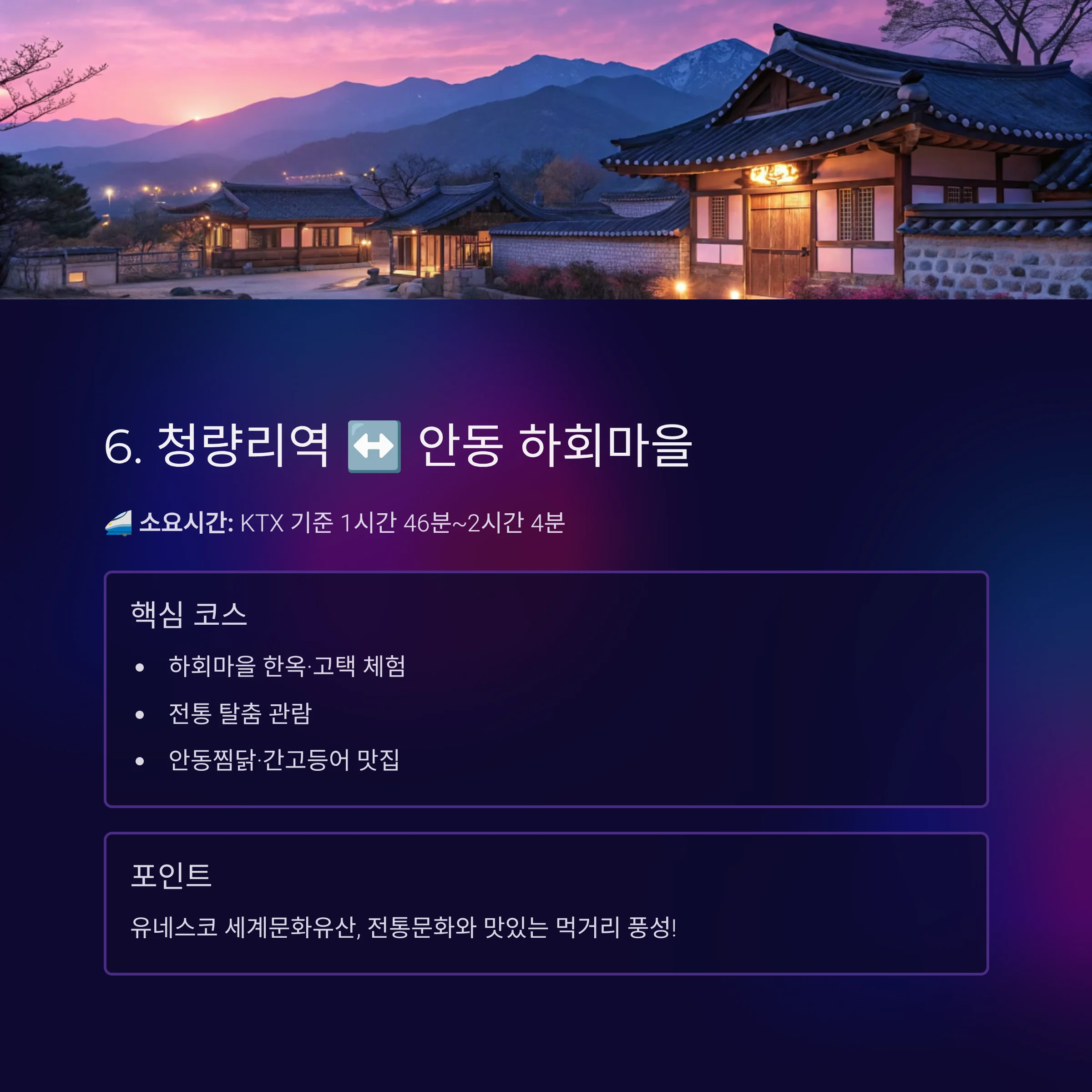 - 핵심 코스: 하회마을 한옥·고택 체험, 안동찜닭·간고등어