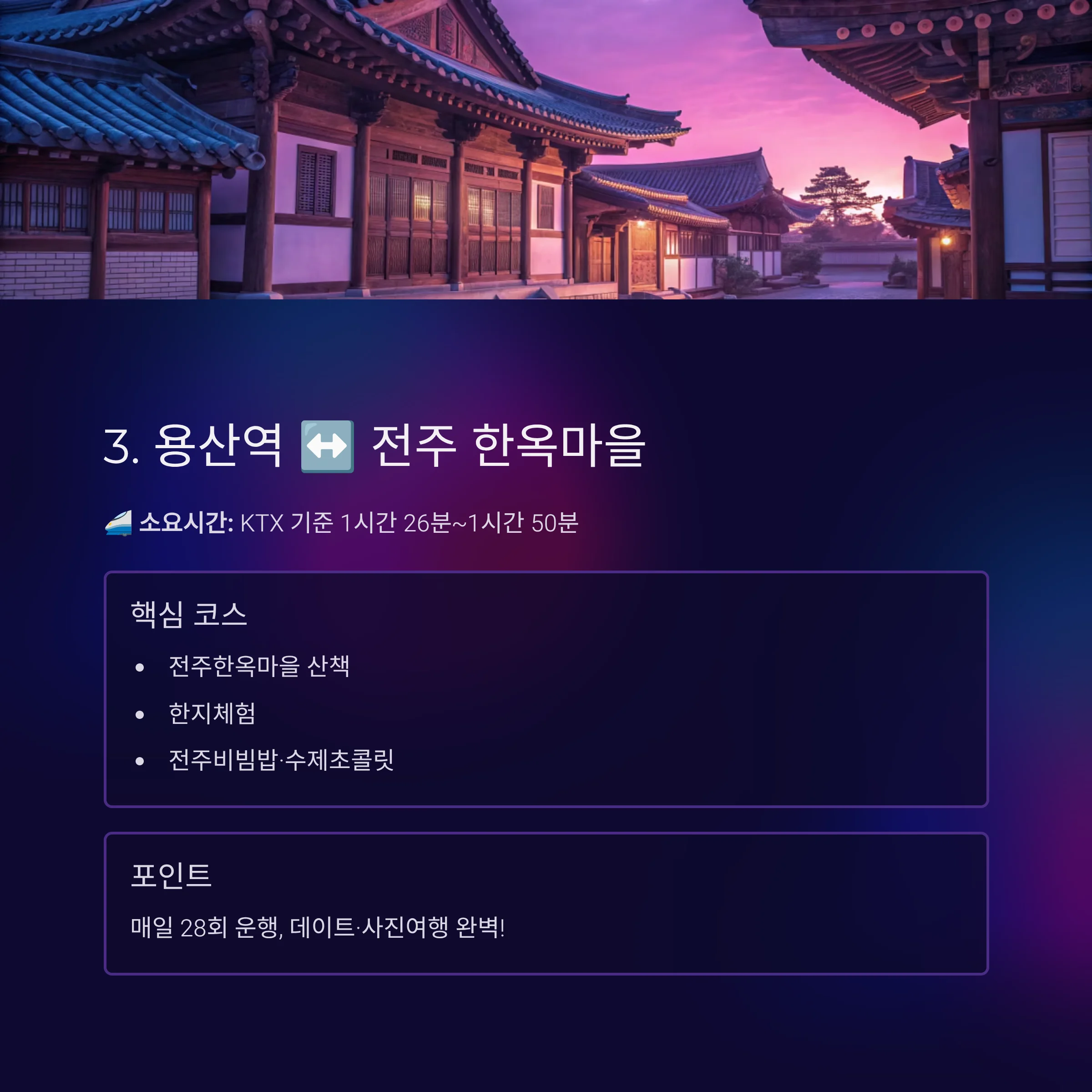 - 핵심 코스: 전주한옥마을, 한지체험, 전주비빔밥·수제초콜릿
