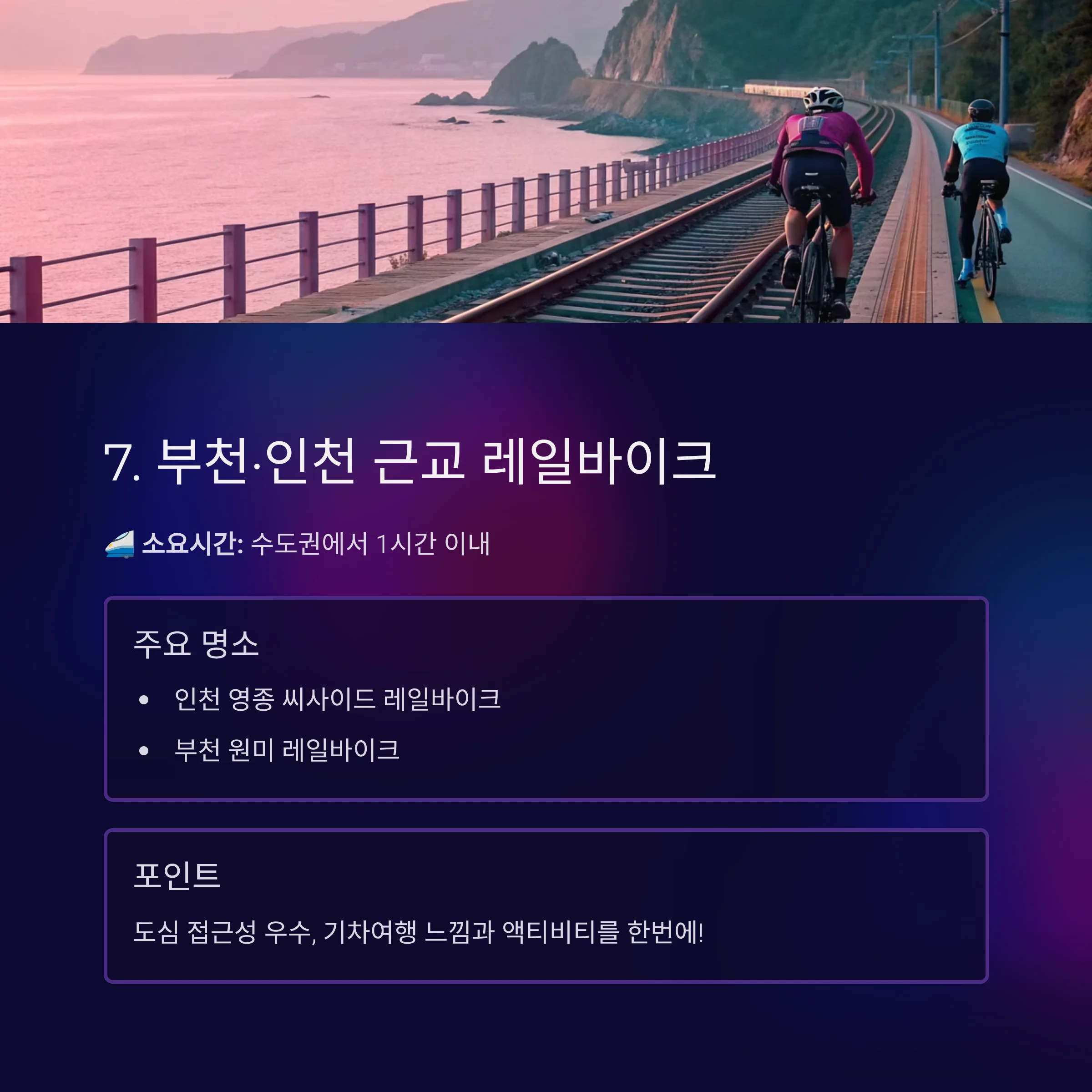 - 주요 명소: 인천 영종 씨사이드 레일바이크, 부천 원미 레일바이크 등