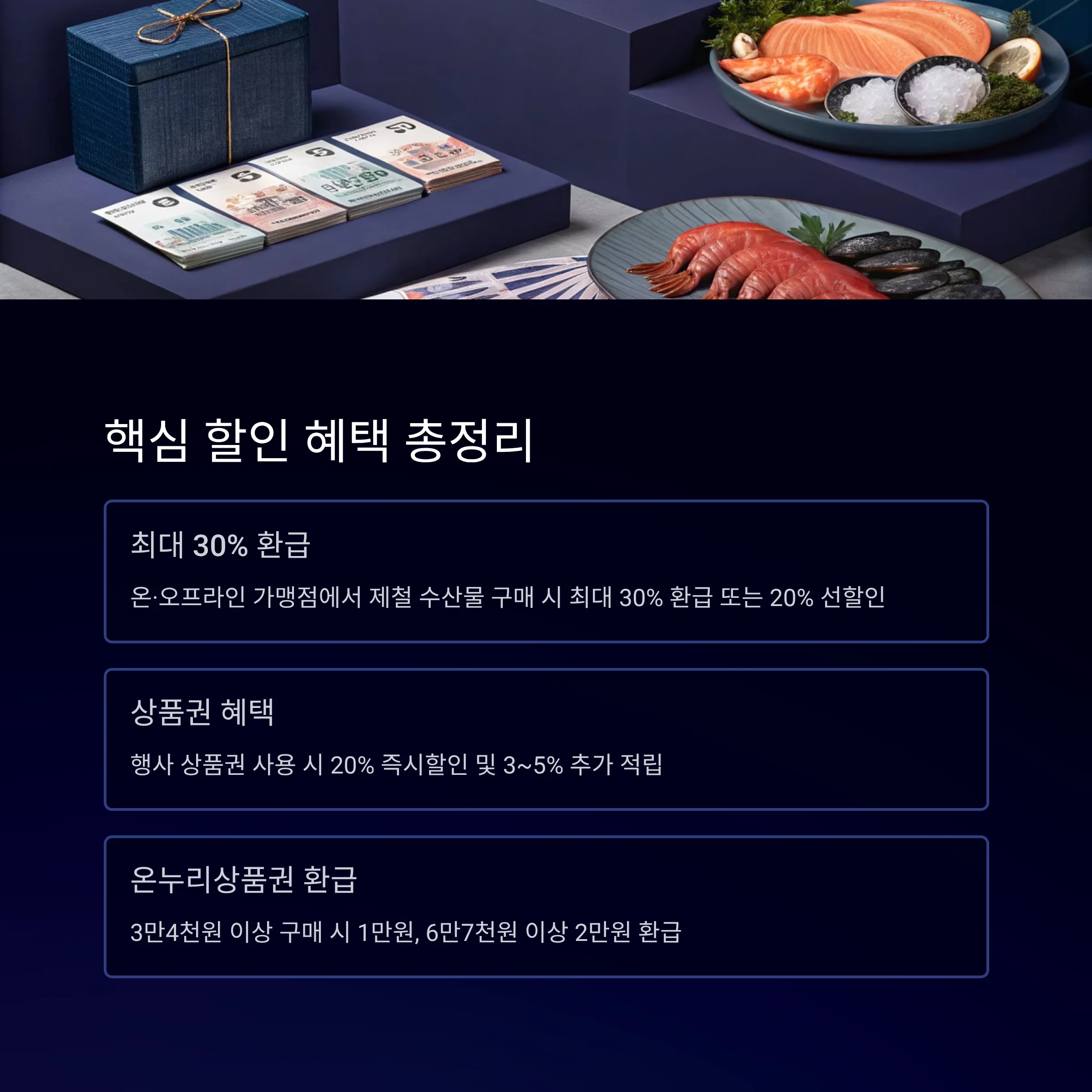 | 여름맞이 특별전 | 7.28(월)~8.21(목) | 전복, 장어, 광어, 명태, 갈치 등 | 최대 30% 환급/최대 20% 선할인 | 프리미엄·보양식 주력 |