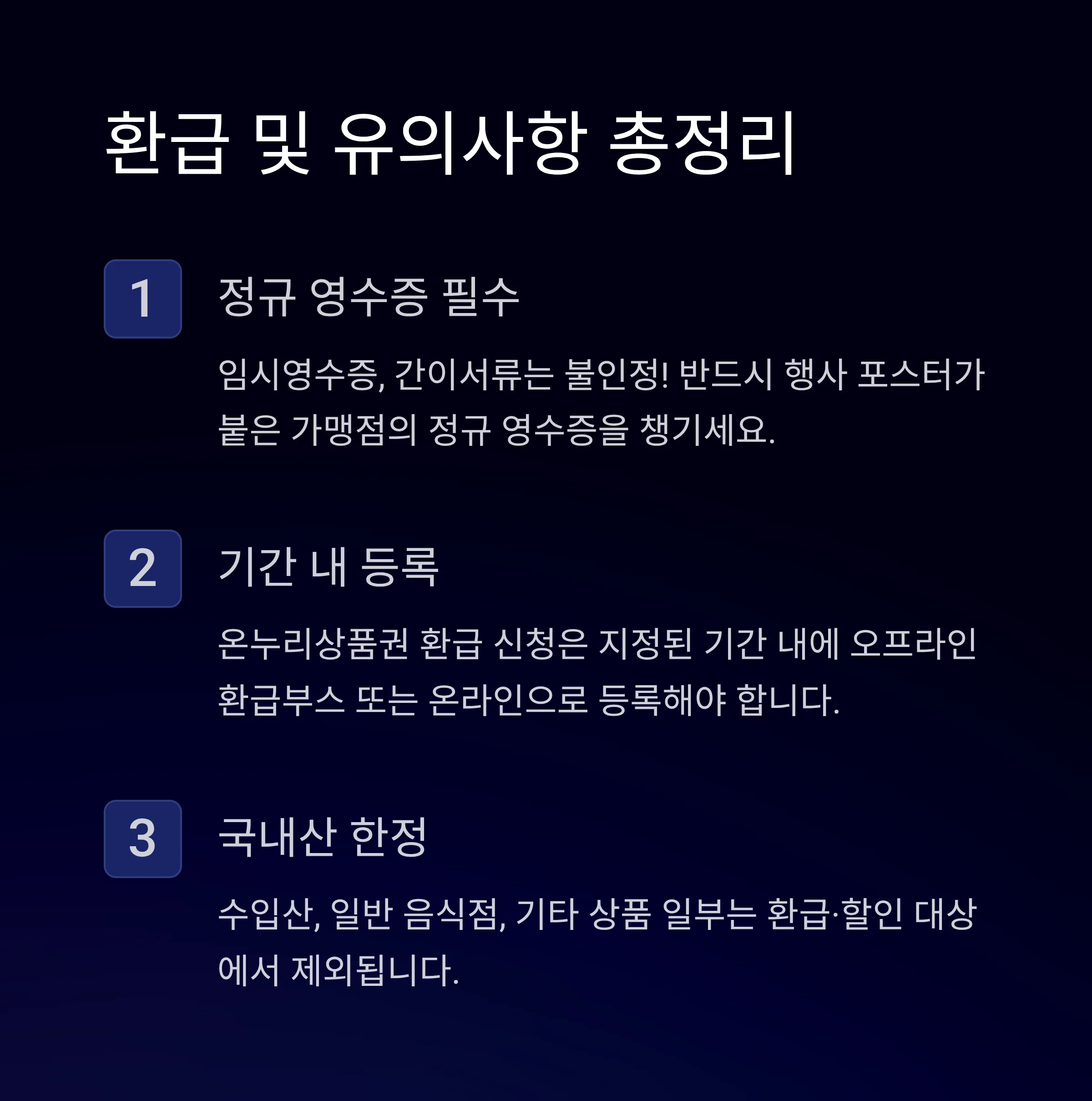 - 환급행사기간(1~5일) 구매 시, 반드시 행사 포스터가 붙은 가맹점/쇼핑몰 이용·정규 영수증 챙기기