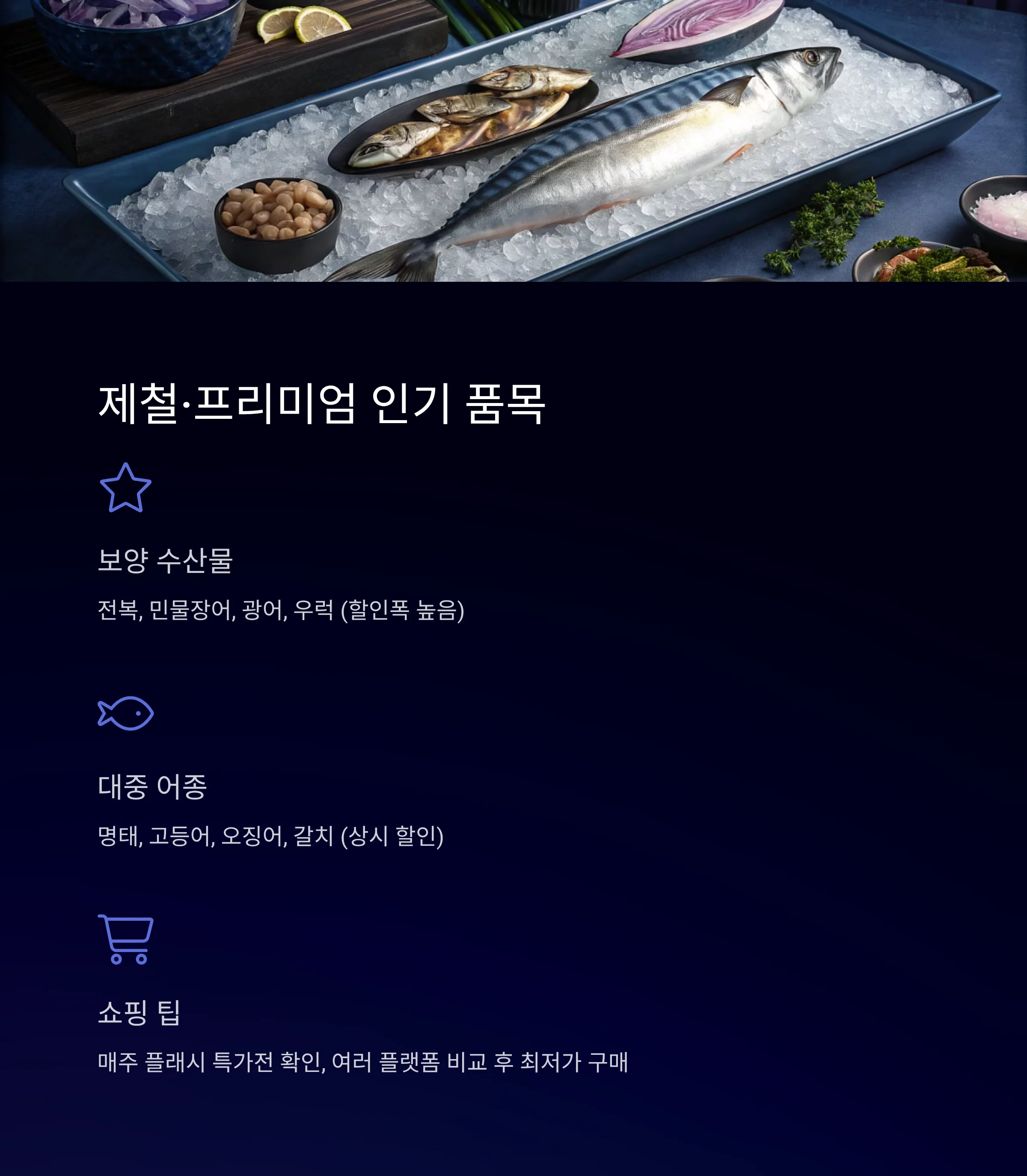- 인기 품목: 전복, 장어, 광어, 명태, 고등어, 오징어, 갈치, 굴, 우럭, 김 등
