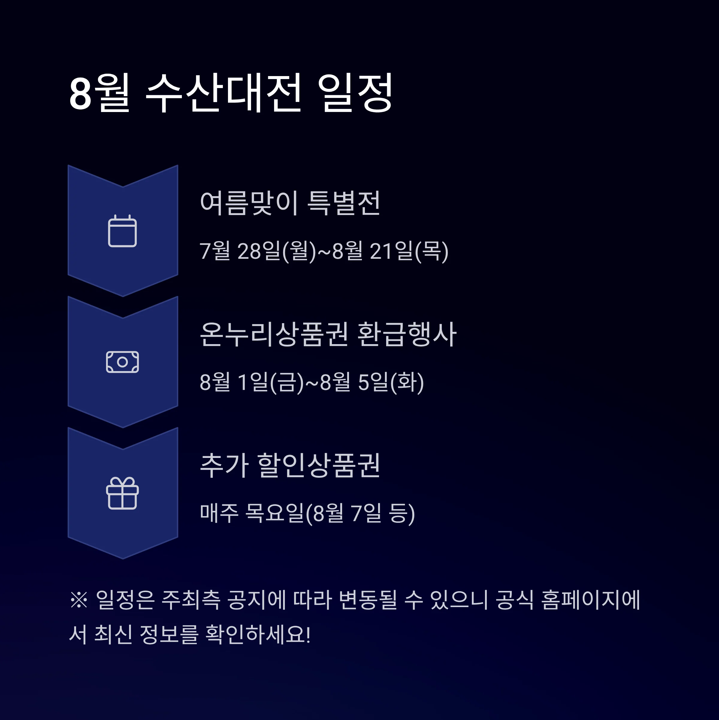 | 온누리상품권 환급행사 | 8.1(금)~8.5(화) | 전 품목 | 1~2만원 상품권 환급 | 실물 영수증 필수 |