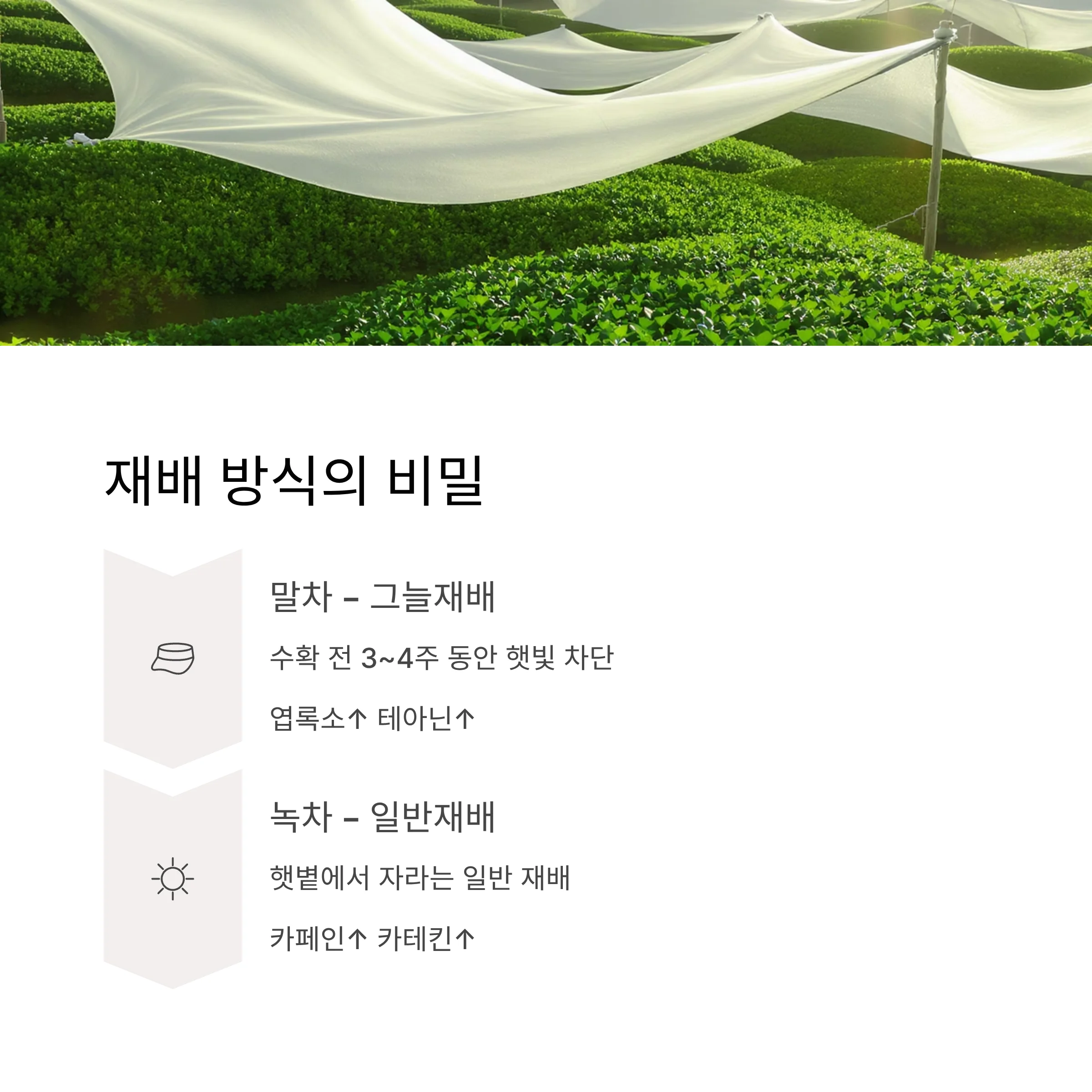 말차는 수확 전 3~4주 동안 햇빛을 차단하고 키운 '그늘재배' 방식이에요.
