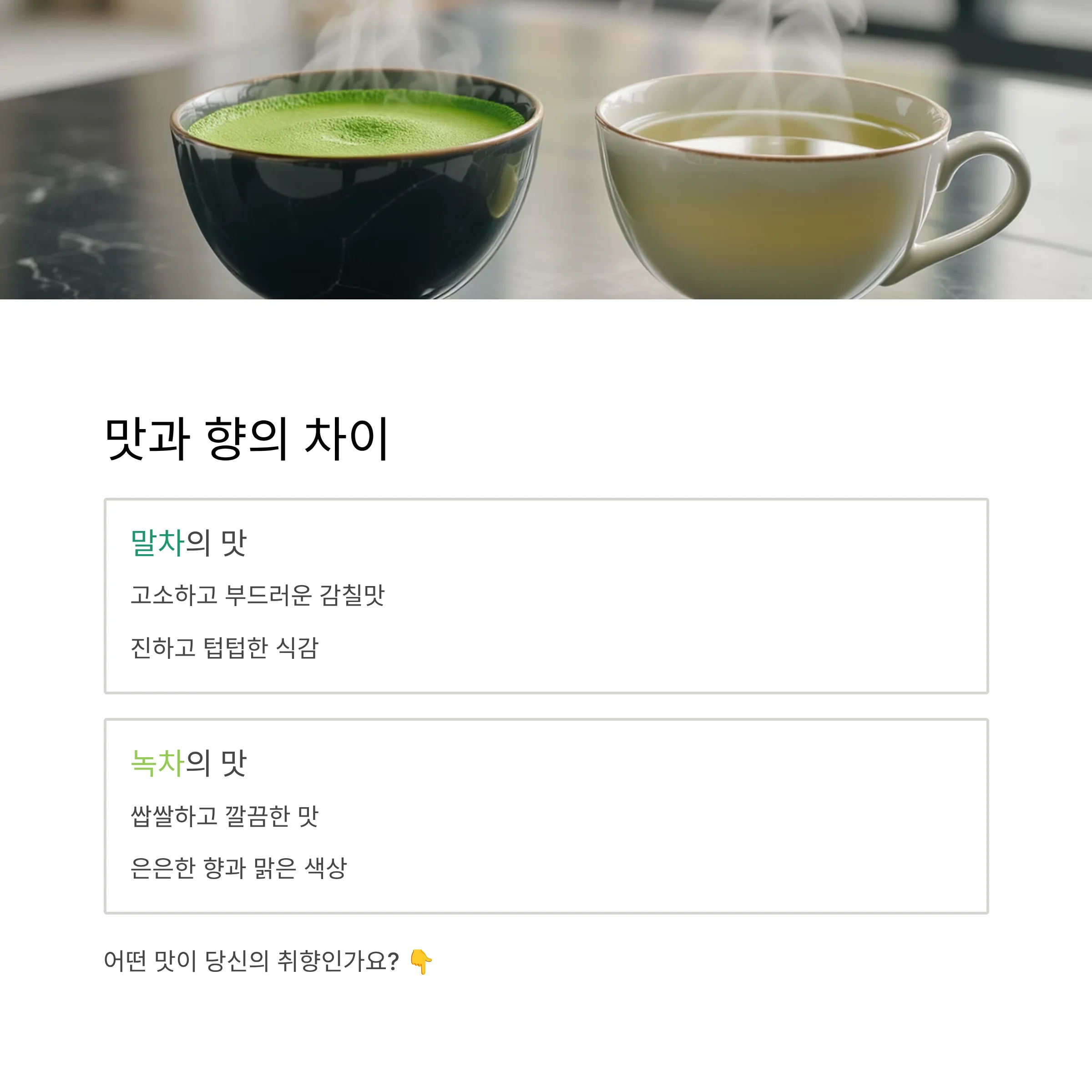 맛과 향, 말차는 부드럽고 녹차는 깔끔하다