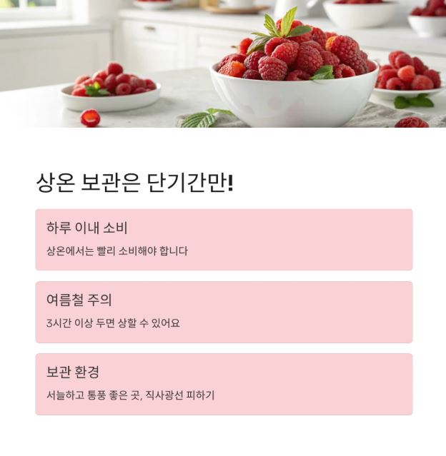 | 상온 보관 | 1일 이내 | 직사광선 피하고 통풍 중요 |