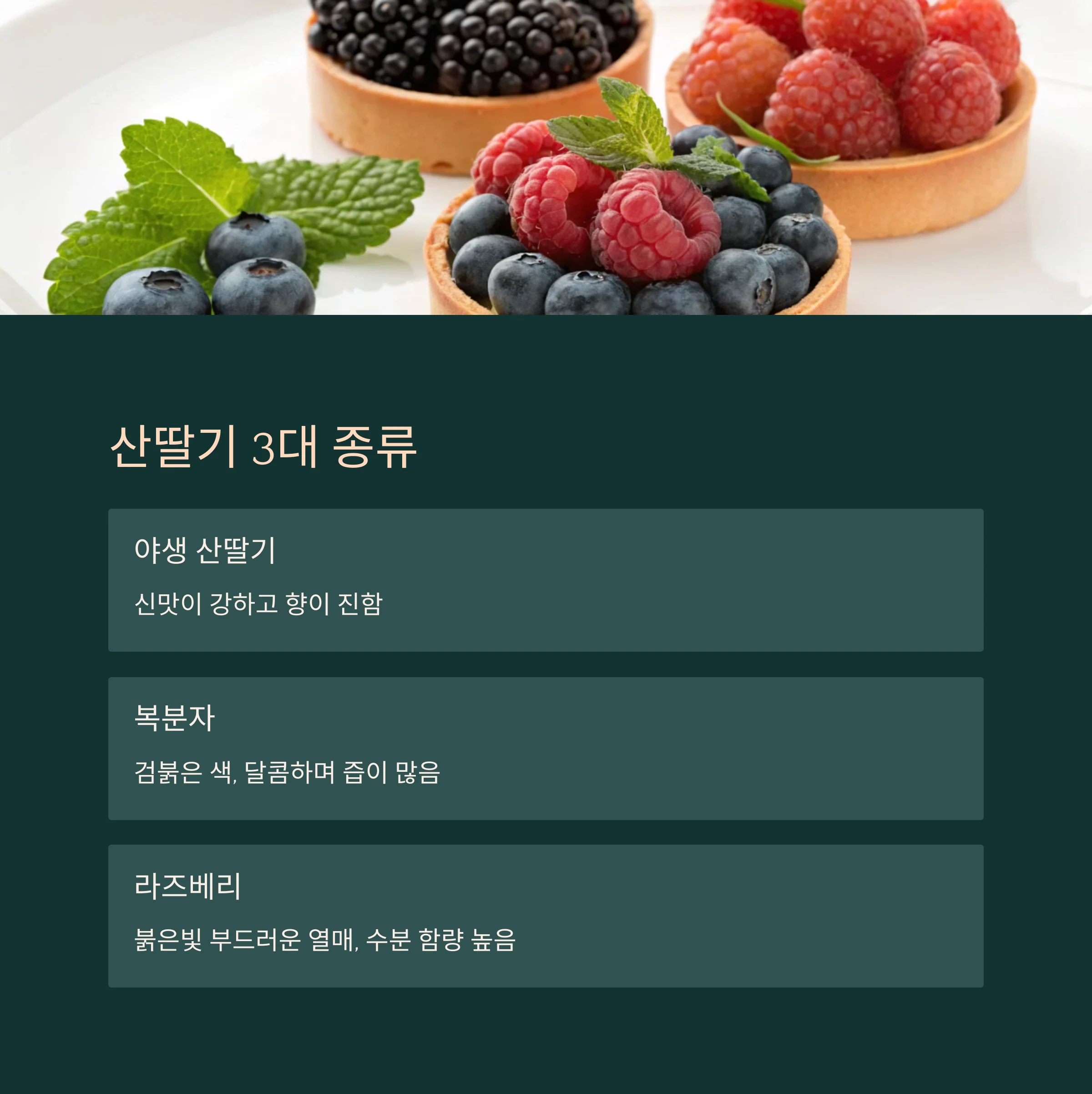 | 야생 산딸기 | 신맛이 강하고 향이 진함 |