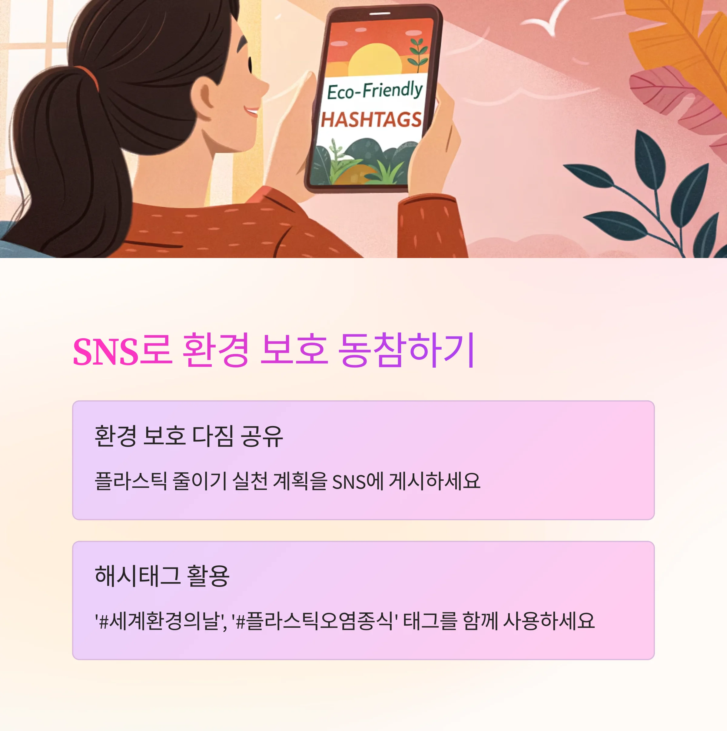 자신의 사회관계망서비스에 플라스틱 줄이기 같은 환경보호에 대한 다짐과 실천 계획을, ‘#세계환경의날’, ‘#플라스틱오염종식’ 같은 해시태그를 포함해서 올려보세요.