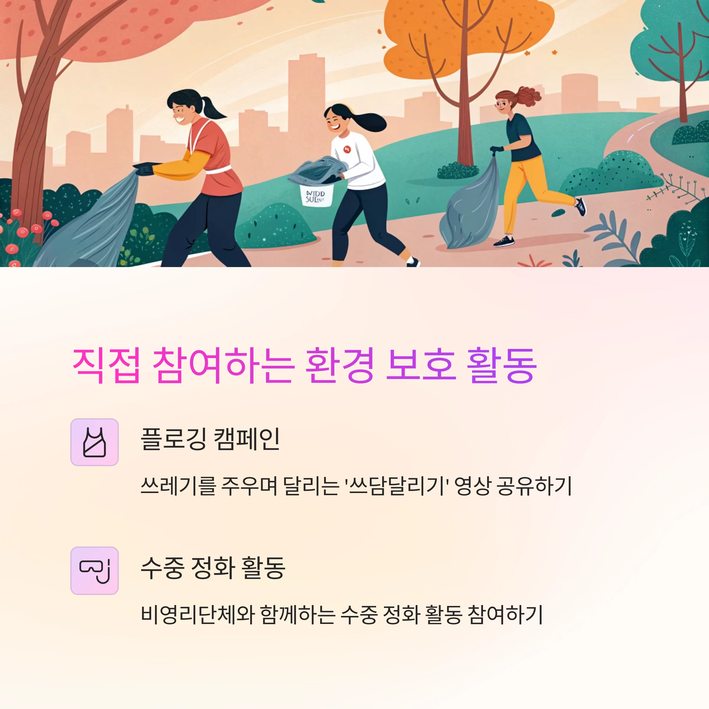 강·산·도심 등 장소와 관계없이 쓰레기를 주우며 달리는 영상을 해시태그와 함께 올리는 ‘쓰담 달리기(플로깅) 캠페인’에 참여해 보세요.