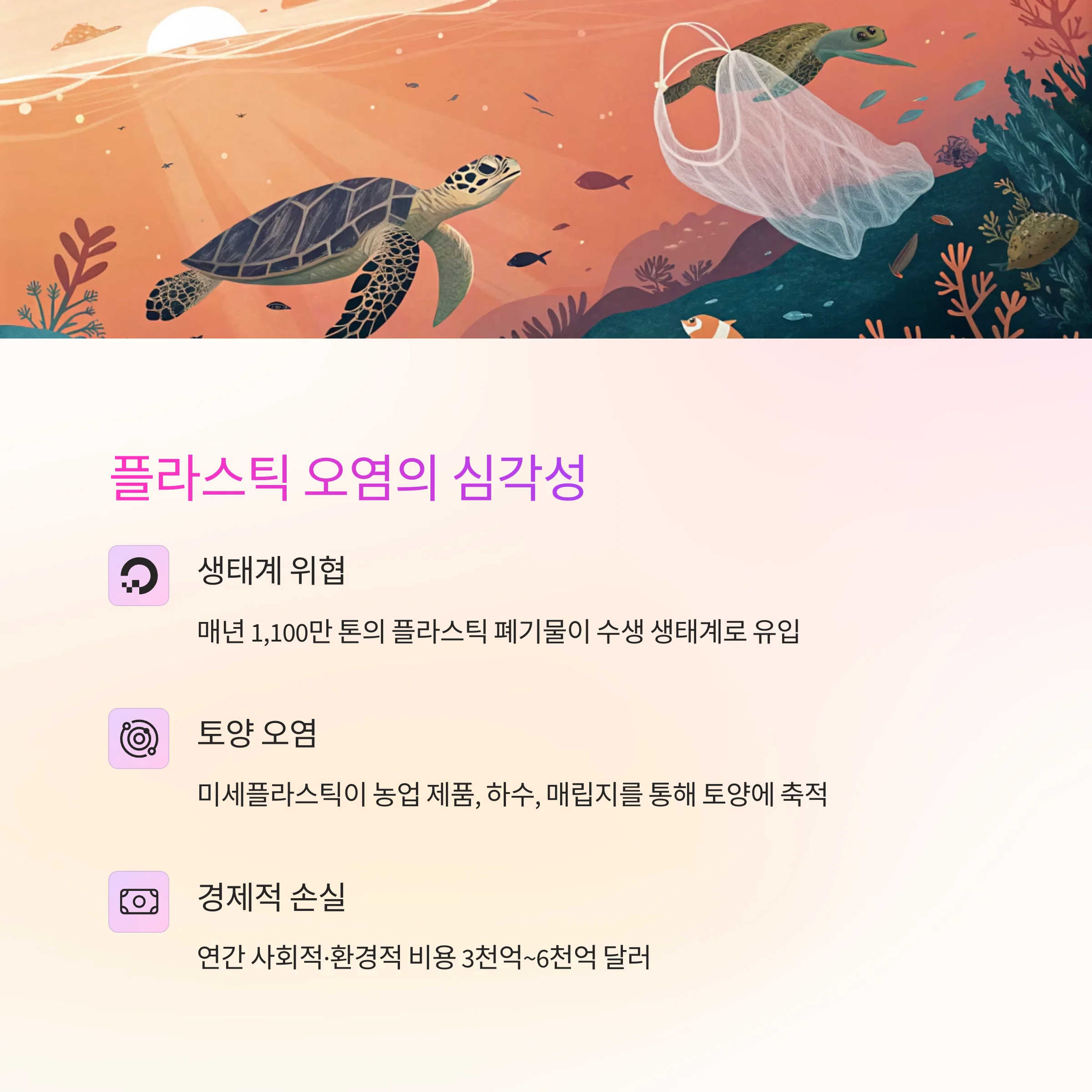 매년 약 1,100만 톤의 플라스틱 폐기물이 수생 생태계로 유입되며, 미세플라스틱은 농업 제품 및 하수, 매립지를 통해 토양에 축적되고 있습니다.