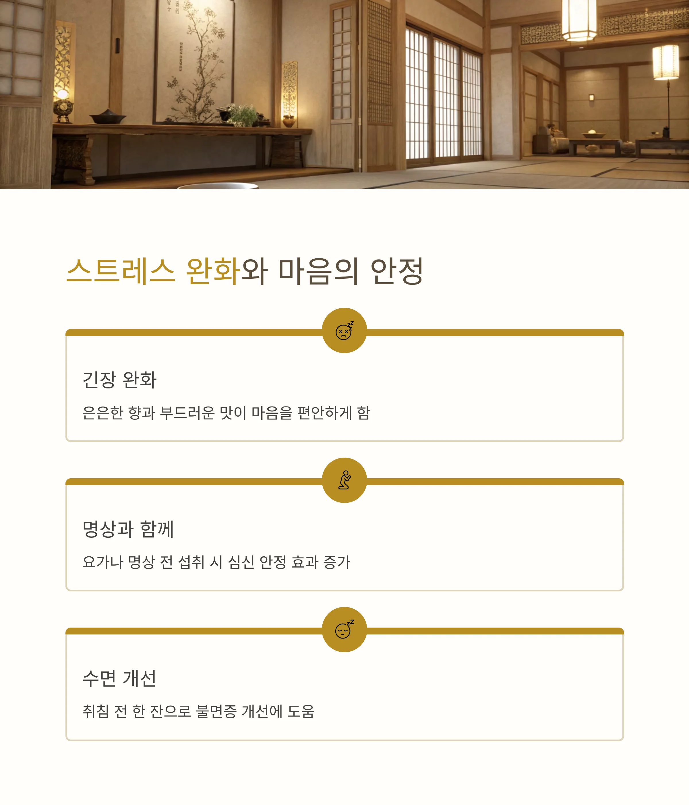 요가나 명상을 하기 전에 마시면 심신 안정에 더욱 도움이 될 수 있으며, 불면 증상이 있는 사람들에게도 저녁 시간대의 섭취를