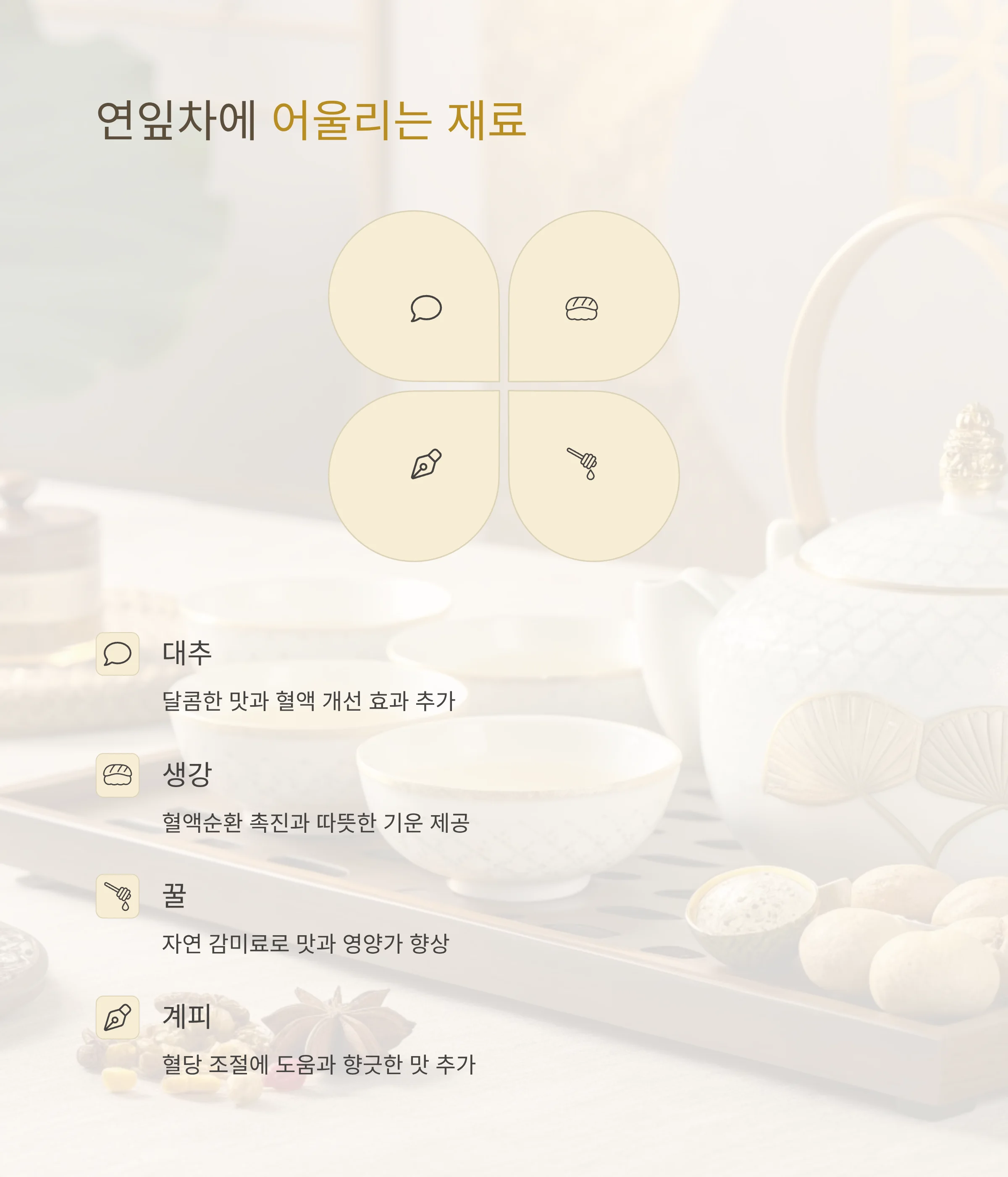 연잎차의 은은한 향과 부드러운 맛은 긴장을 풀어주고 마음을 차분하게 만들어 줍니다.