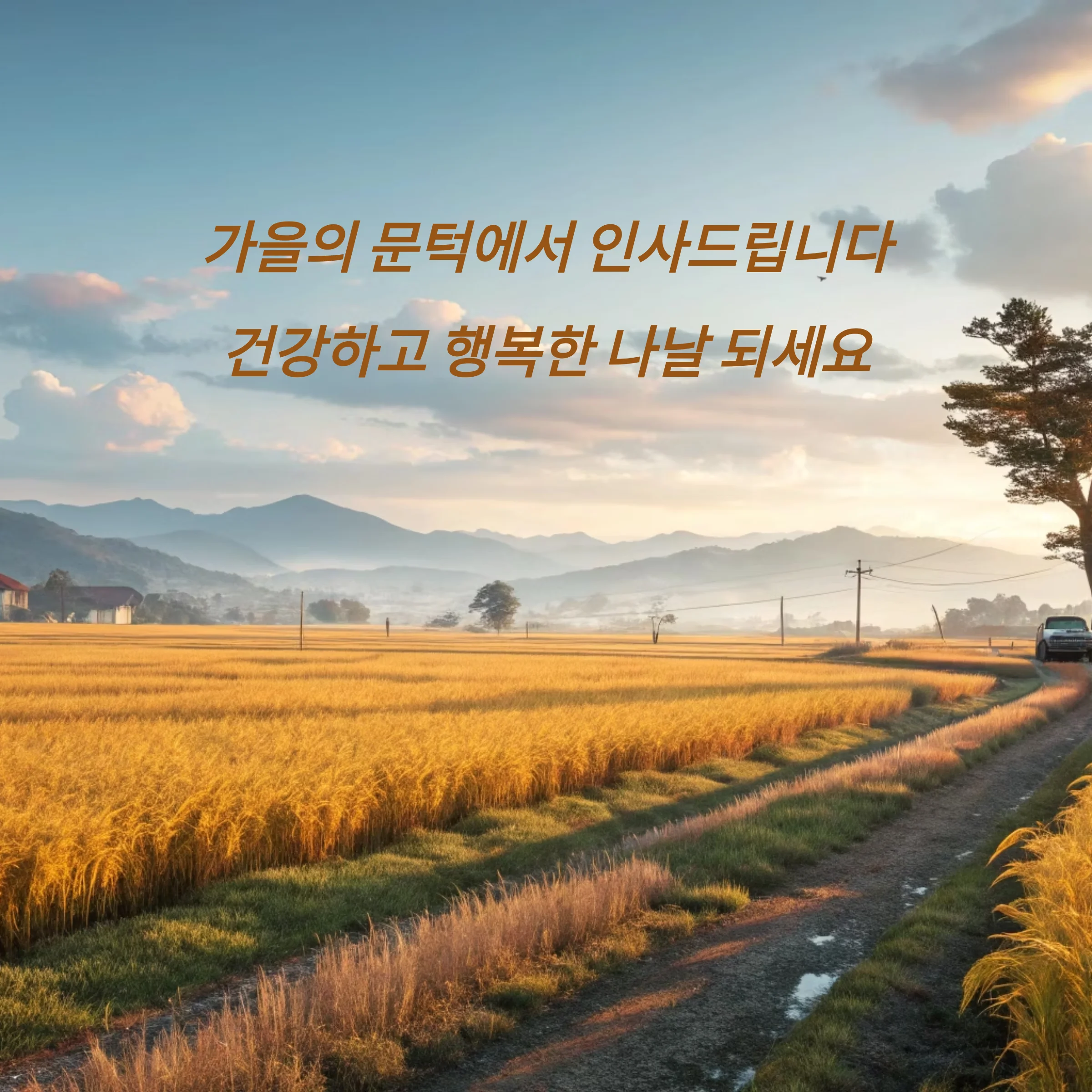 해 질 무렵의 들녘, 억새가 살랑이는 풍경, 낙엽이 날리는 길 위에 적힌 한 줄 인사는 계절을 눈으로 느끼게 해 줍니다.