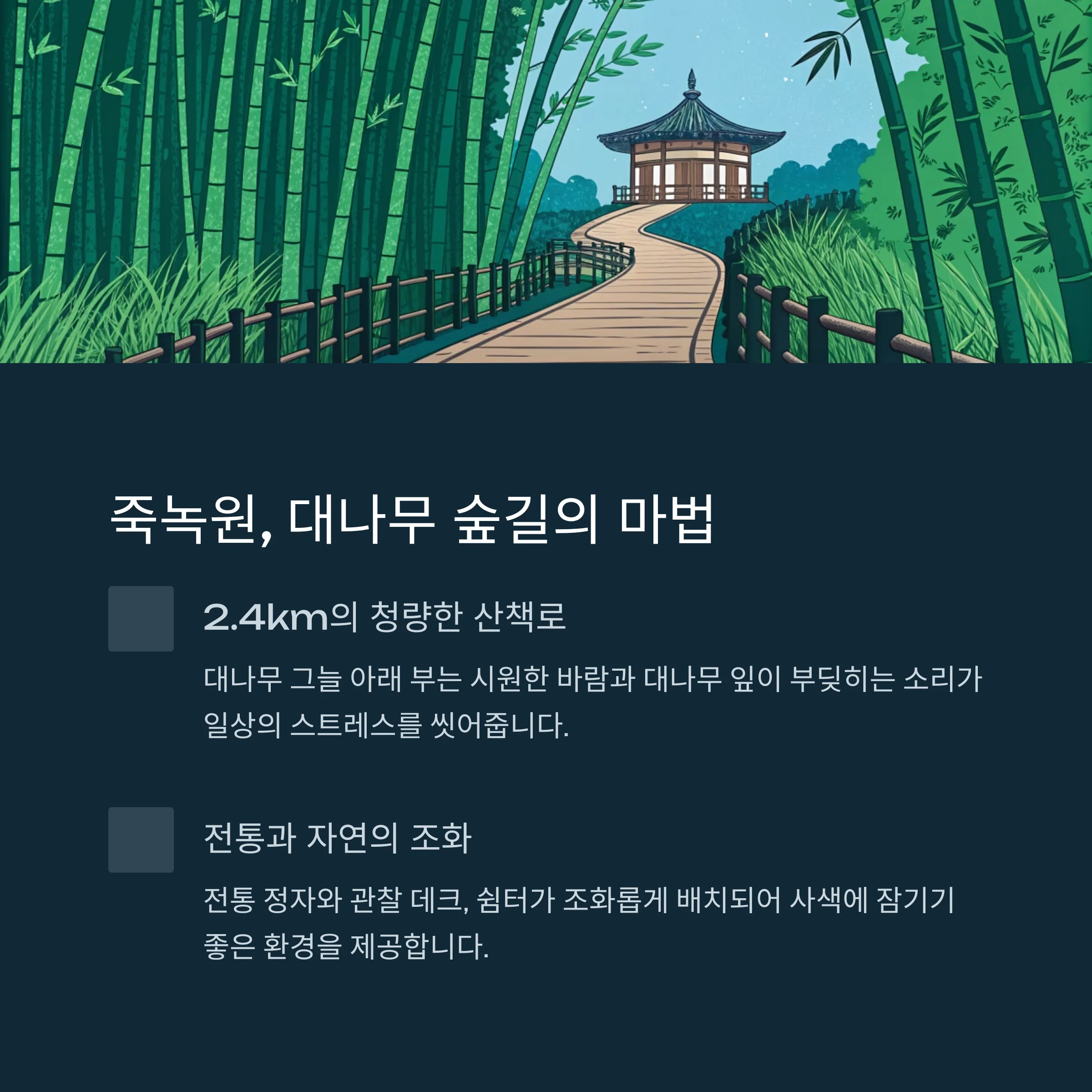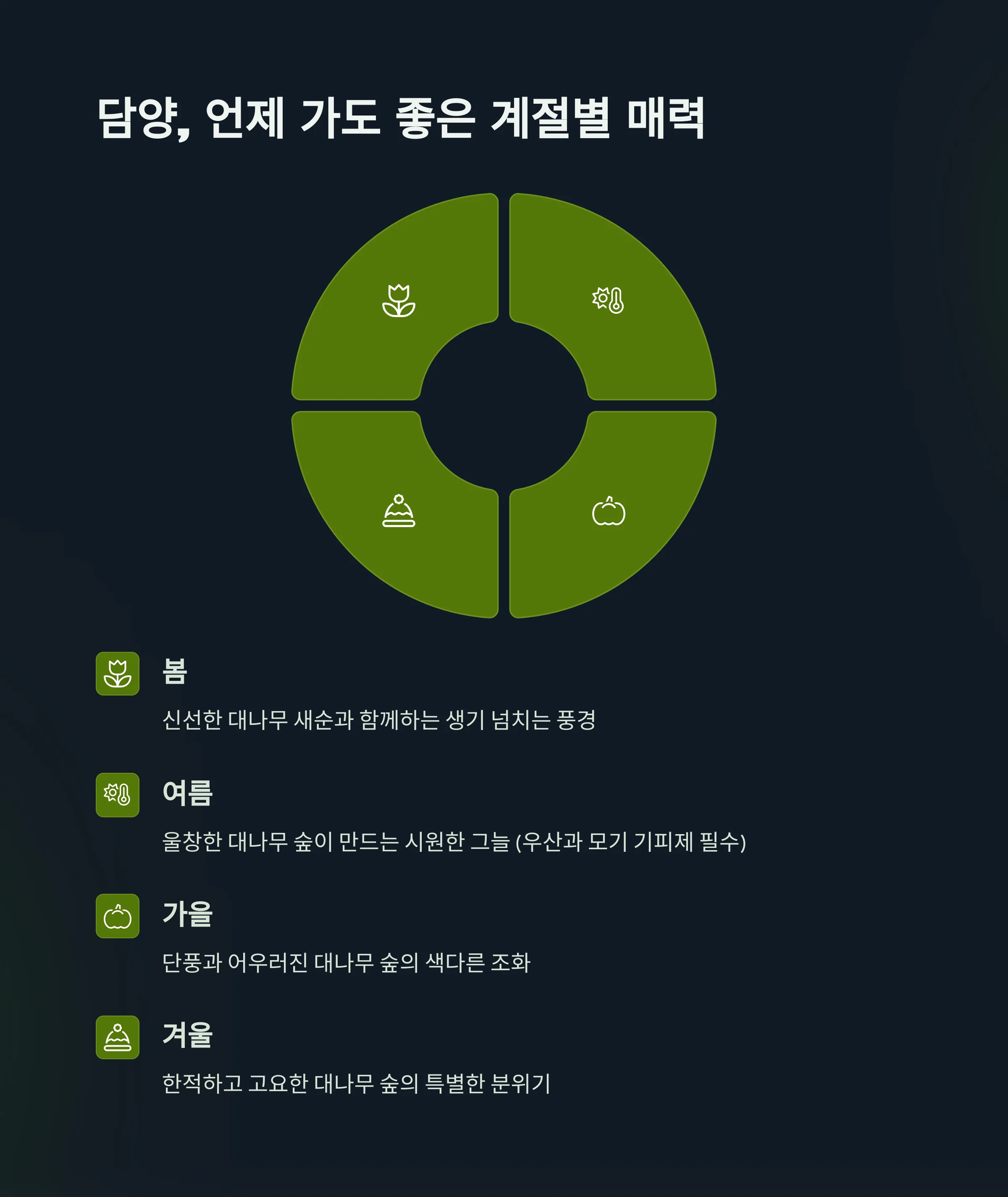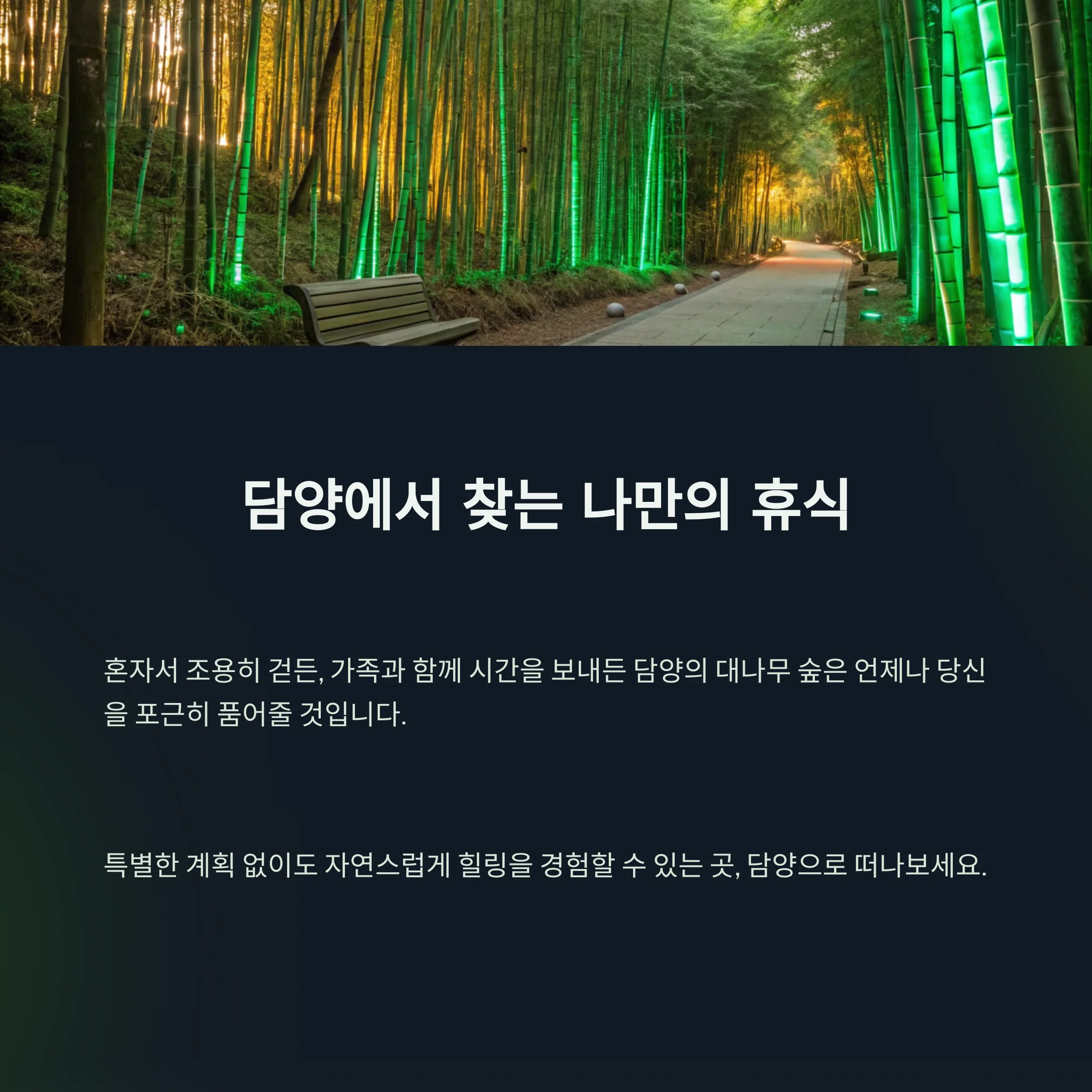 혼자 조용히 걷고 명상하는 여행을 원할 때도, 가족과 함께 자연 속에서 의미 있는 시간을 보내고 싶을 때도 담양은 언제나 옳은 선택이 되어줍니다.