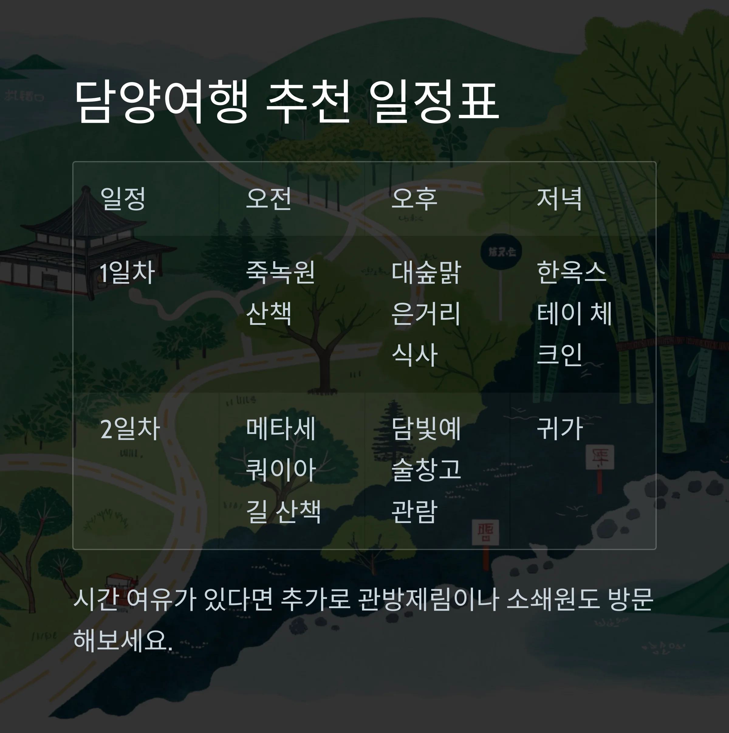 간단한 1박 2일 일정으로도 담양의 여유를 충분히 느낄 수 있습니다.