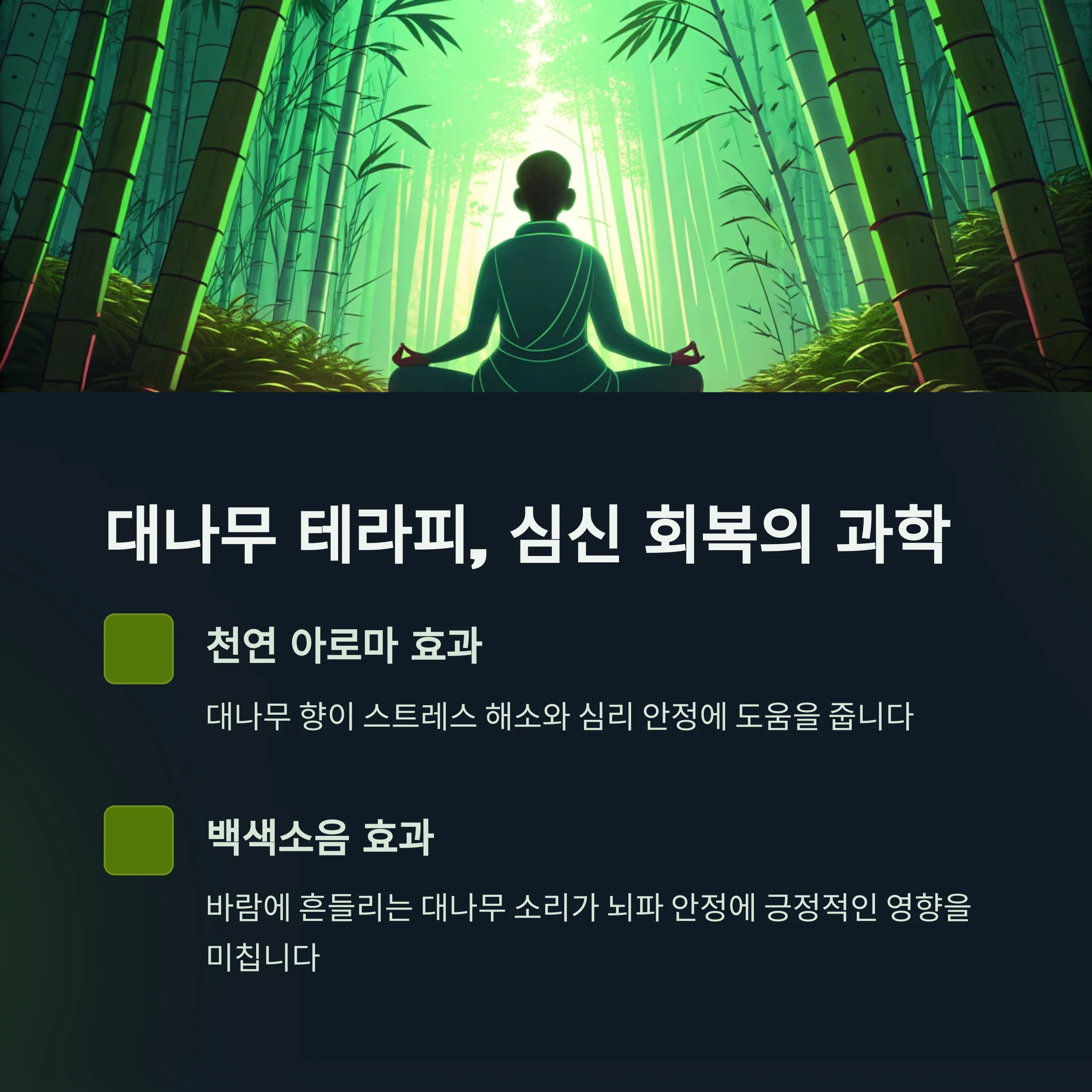 뿐만 아니라 바람에 흔들리는 대나무 소리는 백색소음 효과를 주어 뇌파 안정에도 긍정적인 영향을 미칩니다.