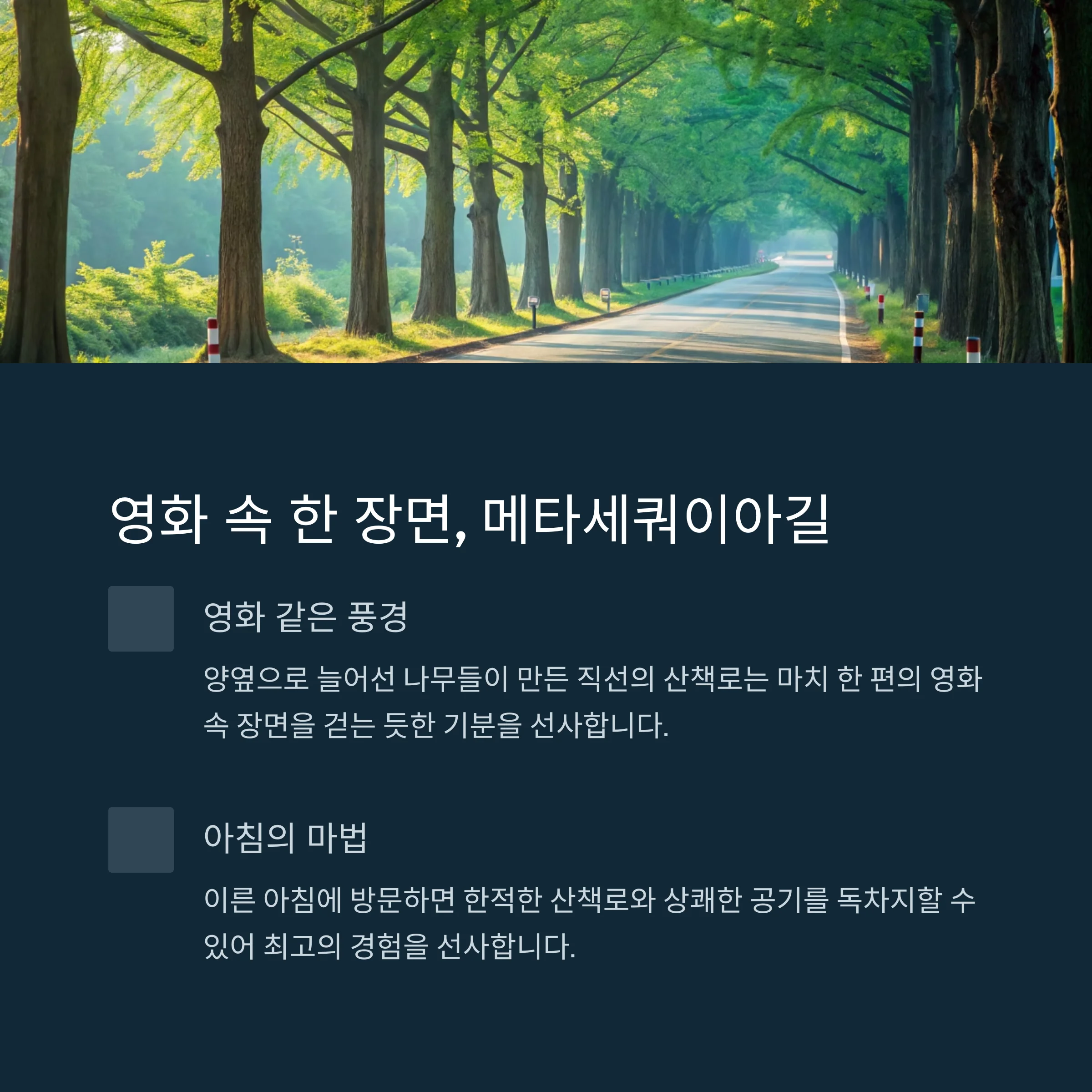 특히 아침 시간대에 방문하면 사람도 적고 공기마저 상쾌해 사진 찍기에도, 조용히 걷기에도 최적의 장소입니다.