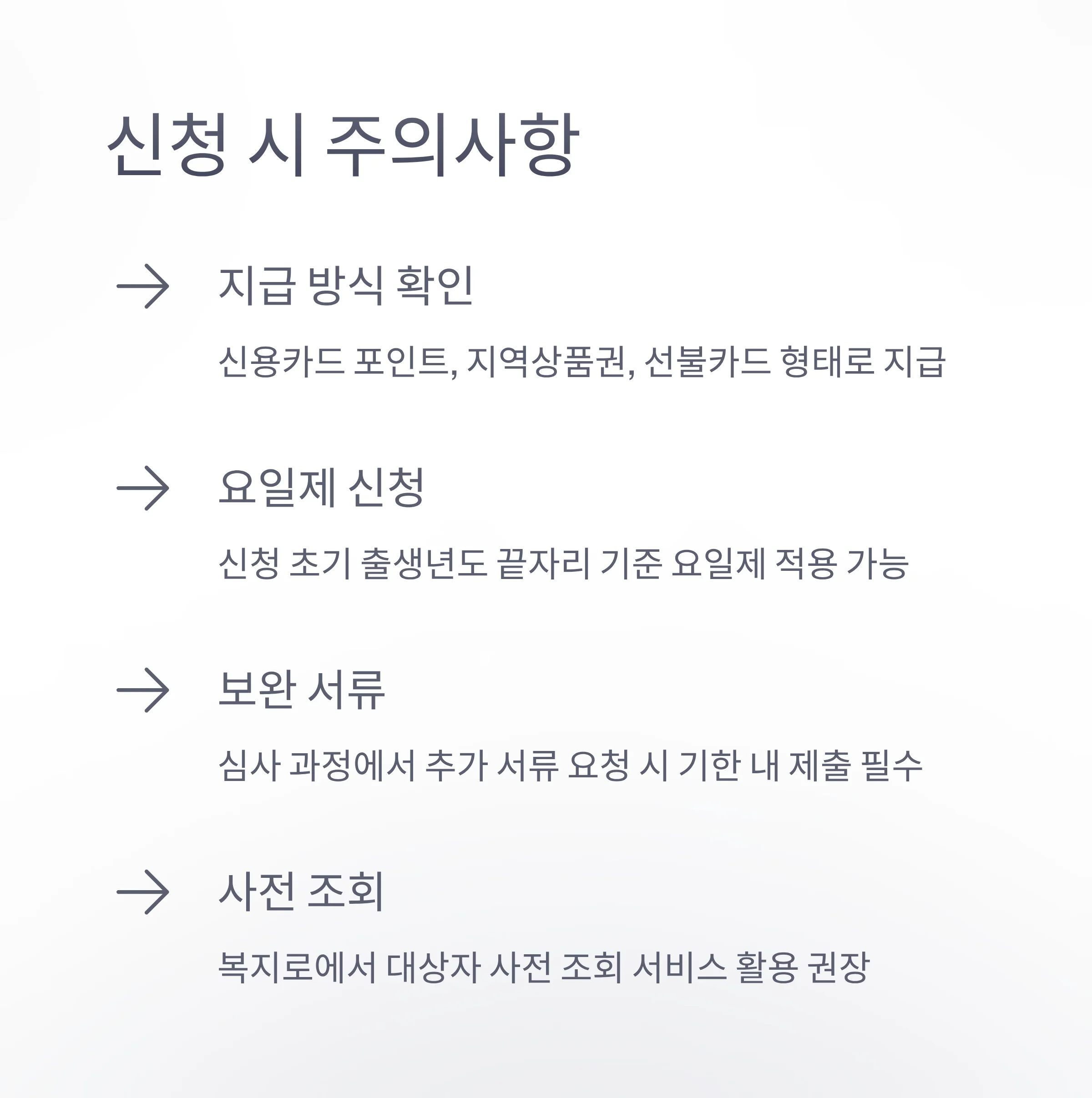 - 본인이 지원 대상인지 불확실할 경우, 복지로 등 신청 사이트에서 제공하는 대상자 사전 조회 서비스를 꼭 이용하시길 권장합니다.