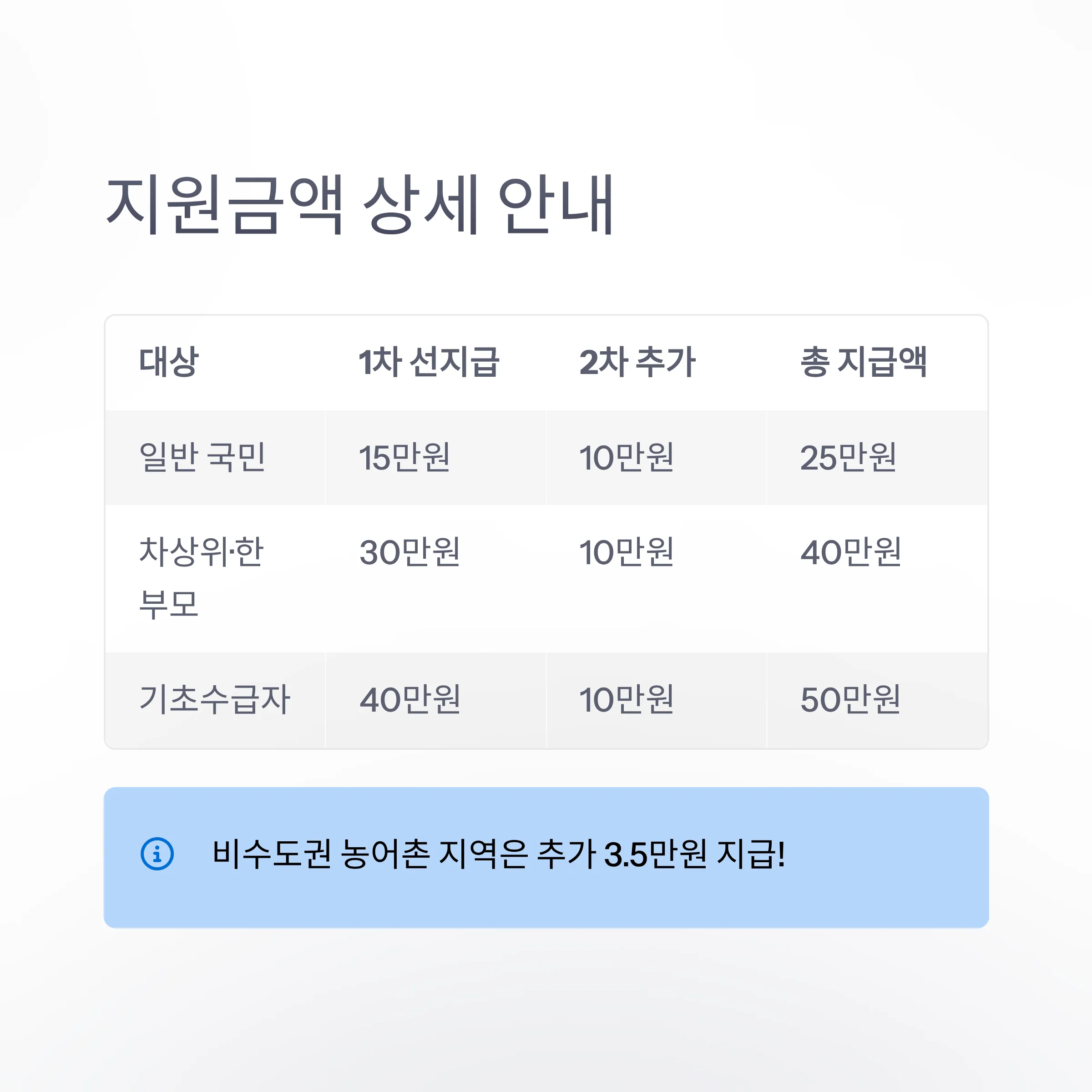 | 대상 | 1차 선지급 (만원) | 2차 추가지급 (만원) | 1~2차 총 지급액 (만원) |