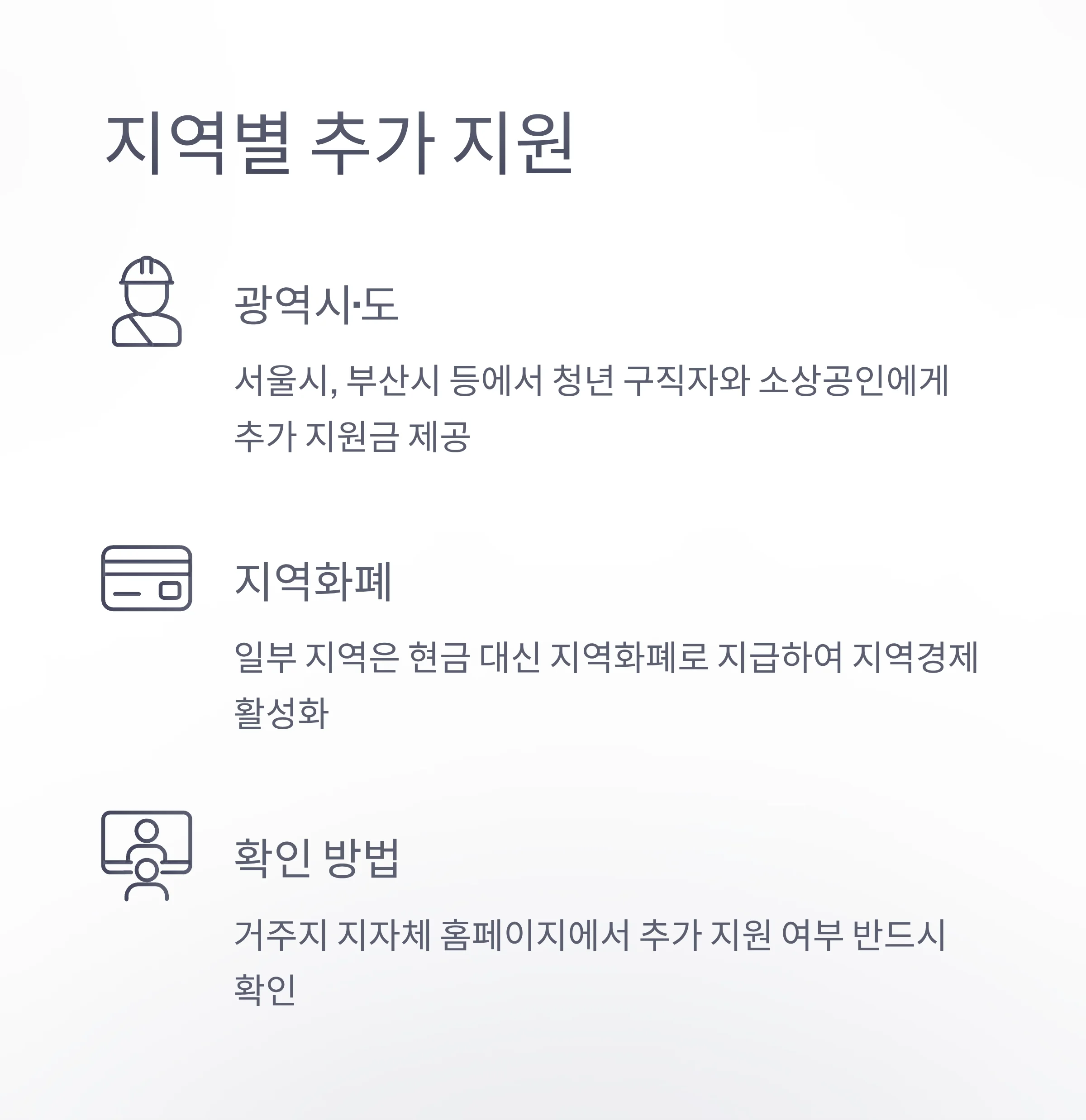 예를 들어 서울시, 부산시 등은 청년 구직자나 소상공인에게 추가 지원금을 제공하며, 일부 지역은 지역화폐로 지급합니다.