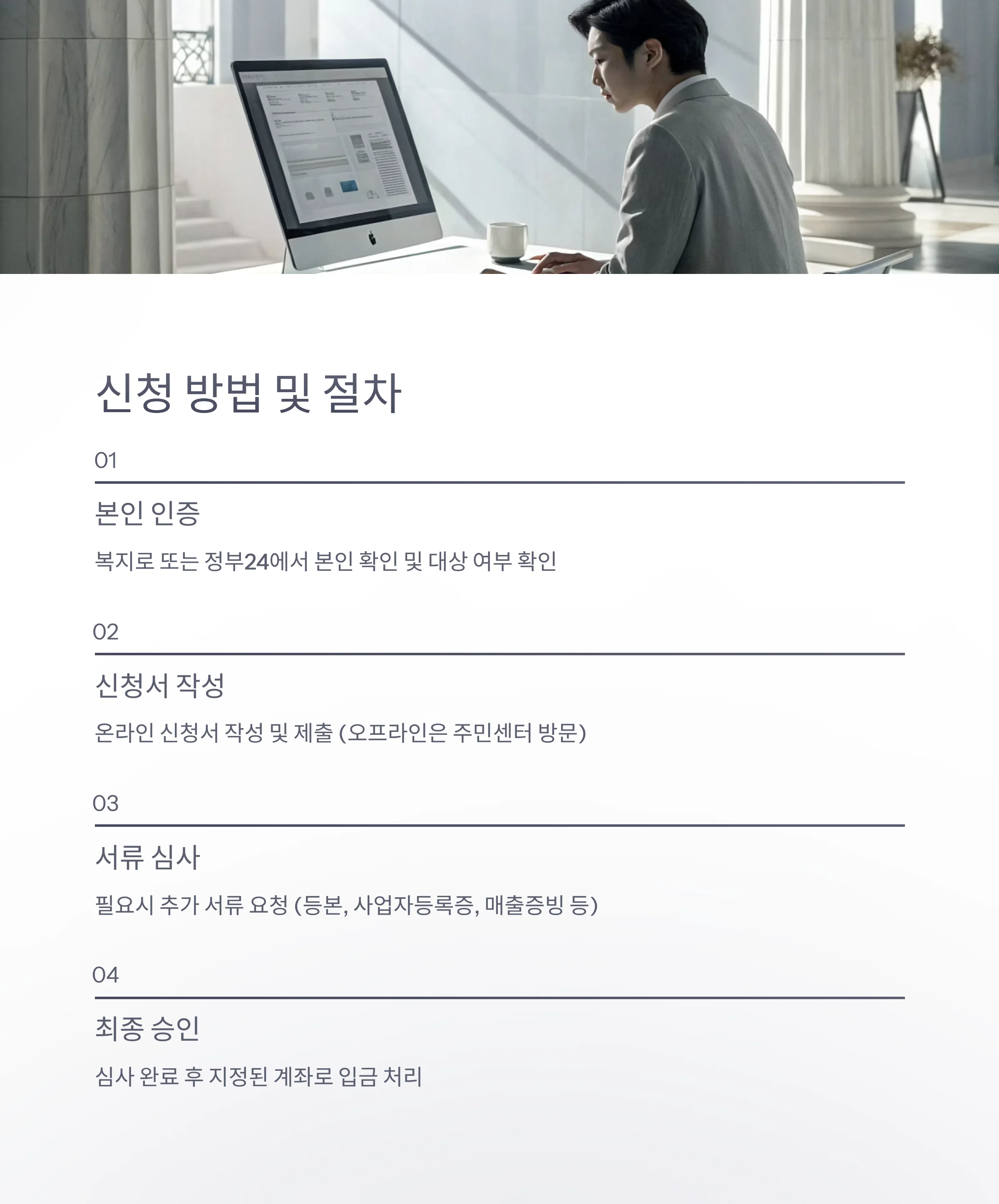 | 3단계 | 서류 심사 및 보완 요청 가능 (주민등록등본, 사업자등록증, 매출 증빙서류 등) |