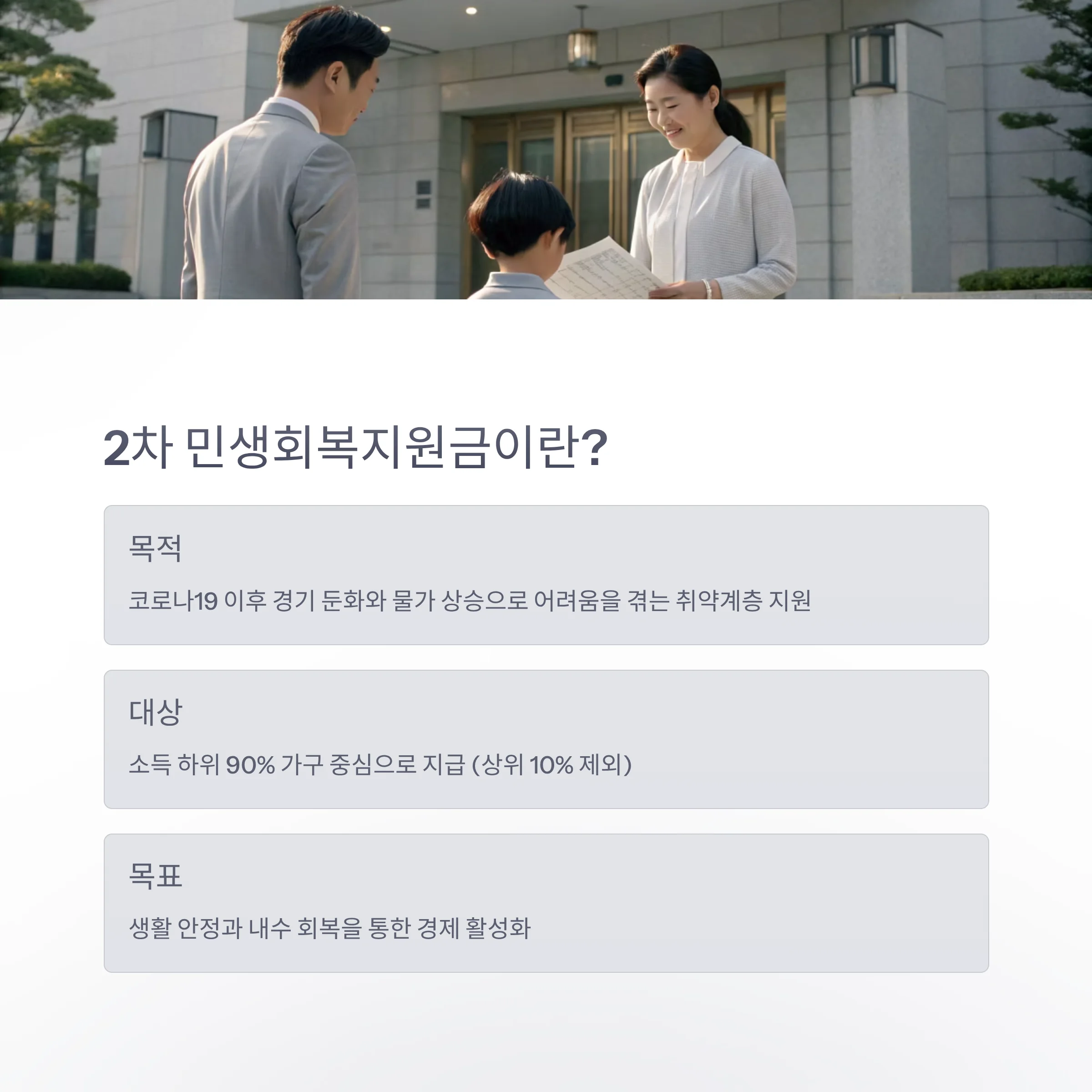 이번 지원금은 기존 1차 지원금 대비 대상과 지원 범위를 확대하여 생활 안정과 내수 회복을 목표로 합니다.