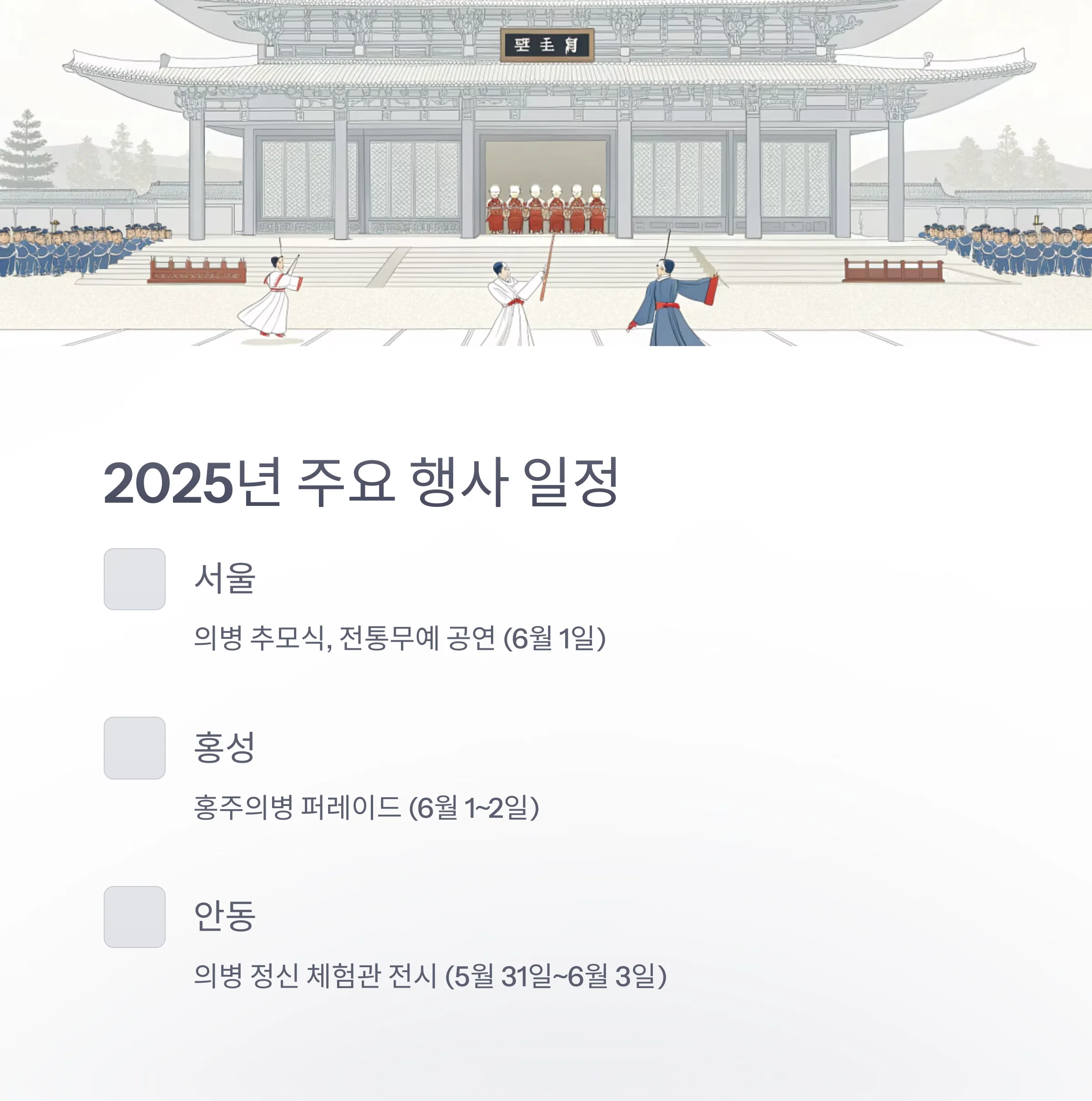 | 서울 | 의병 추모식, 전통무예 공연 | 6월 1일 |