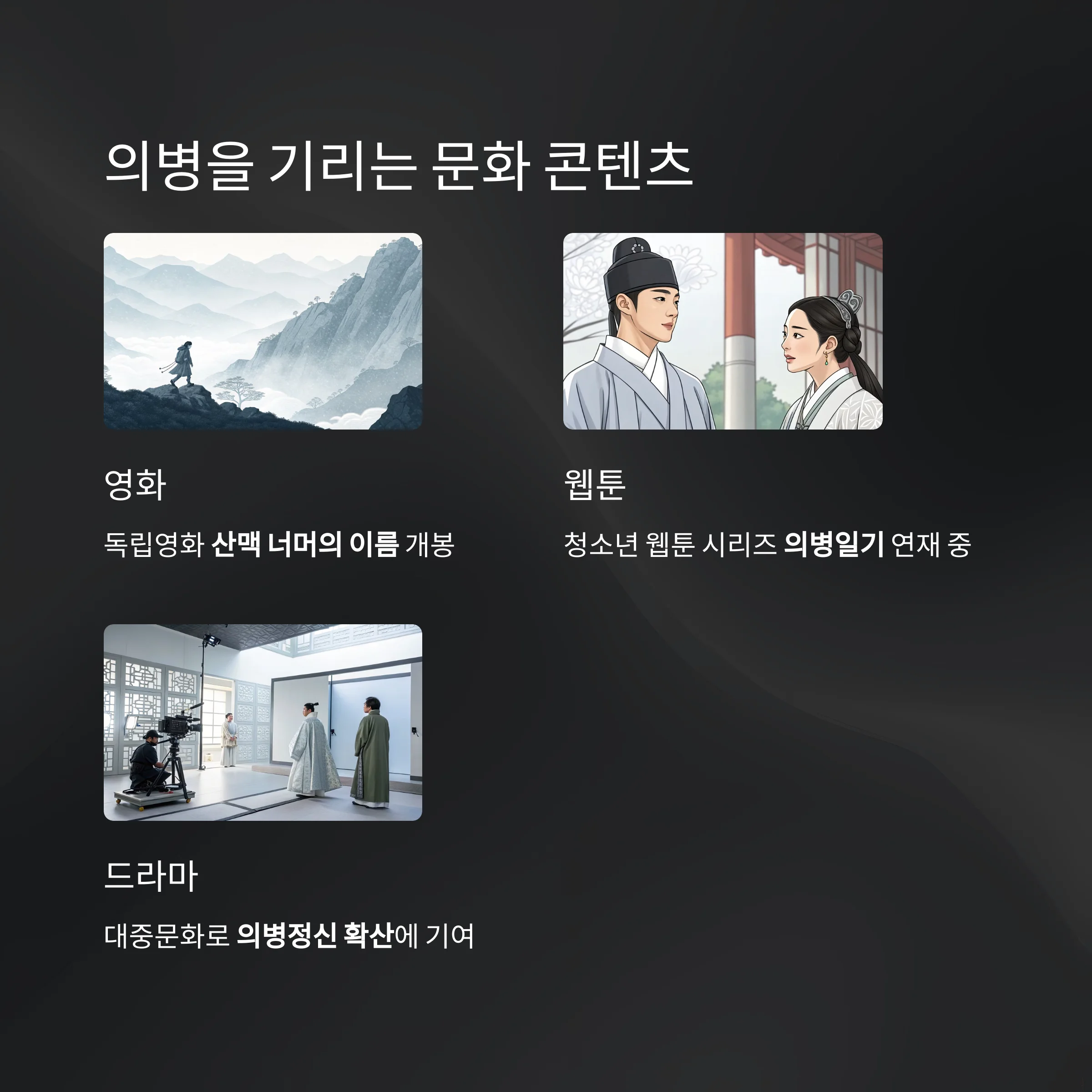 최근에는 영화, 드라마, 웹툰 등 다양한 문화 콘텐츠에서도 의병을 소재로 다루며 대중적 관심을 끌고 있습니다.