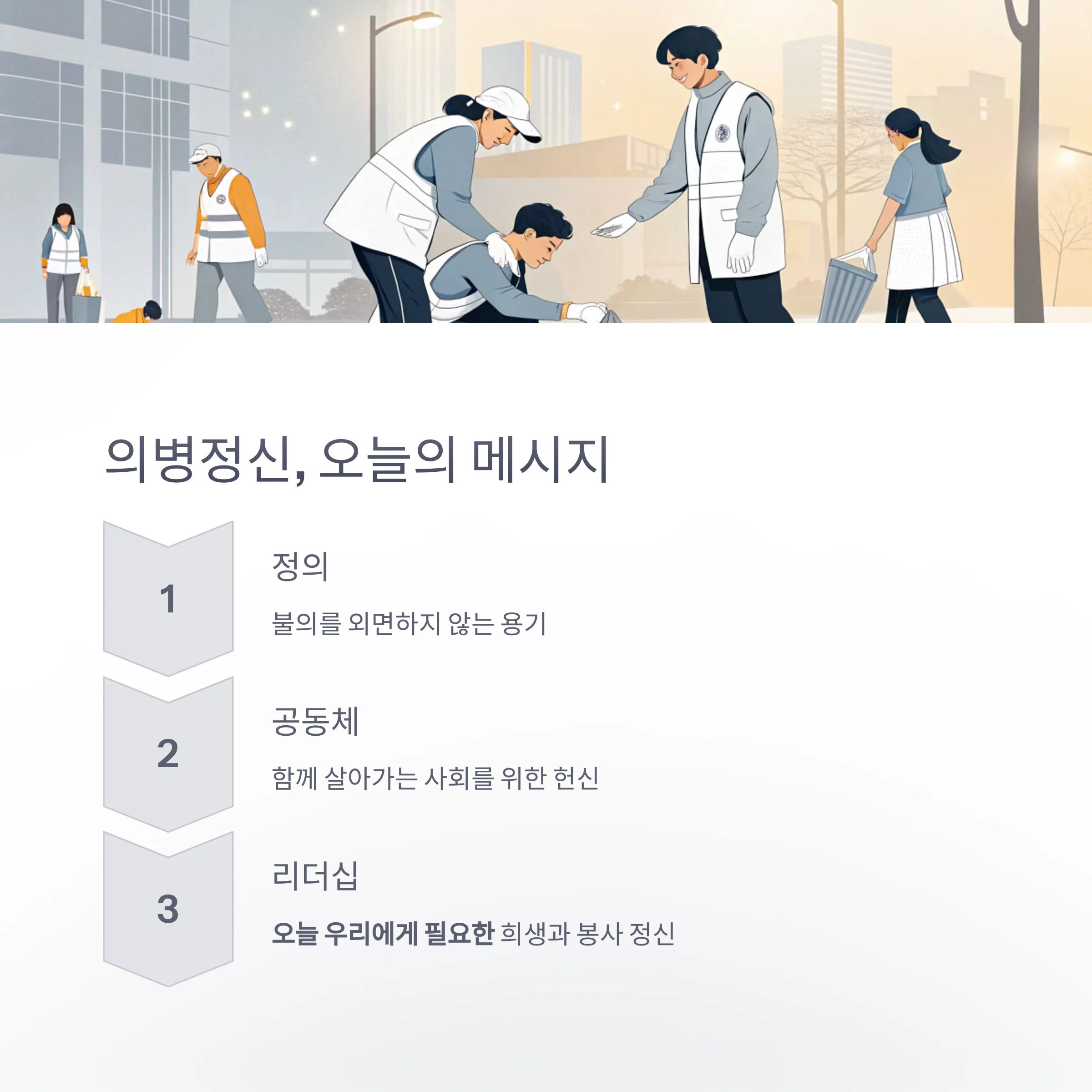 우리 사회가 당면한 위기나 혼란 속에서도 나라를 위해 자신을 던질 수 있는 용기와 책임감을 의병의 정신에서 배워야 합니다.