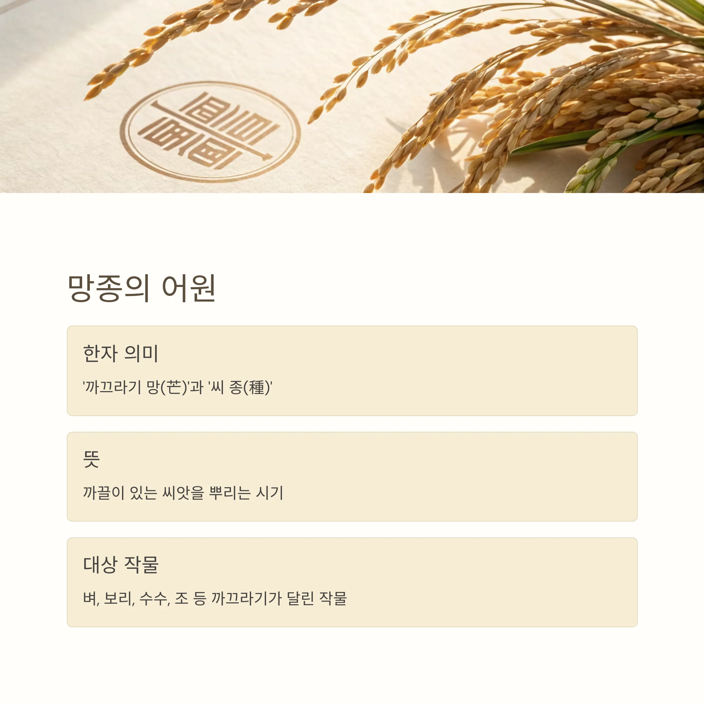 '망종'은 한자로 '까끄라기 망(芒)'과 '씨 종(種)'으로 이루어져 있으며, 까끌이 있는 씨앗을 뿌리는 시기라는 뜻을 담고 있습니다.