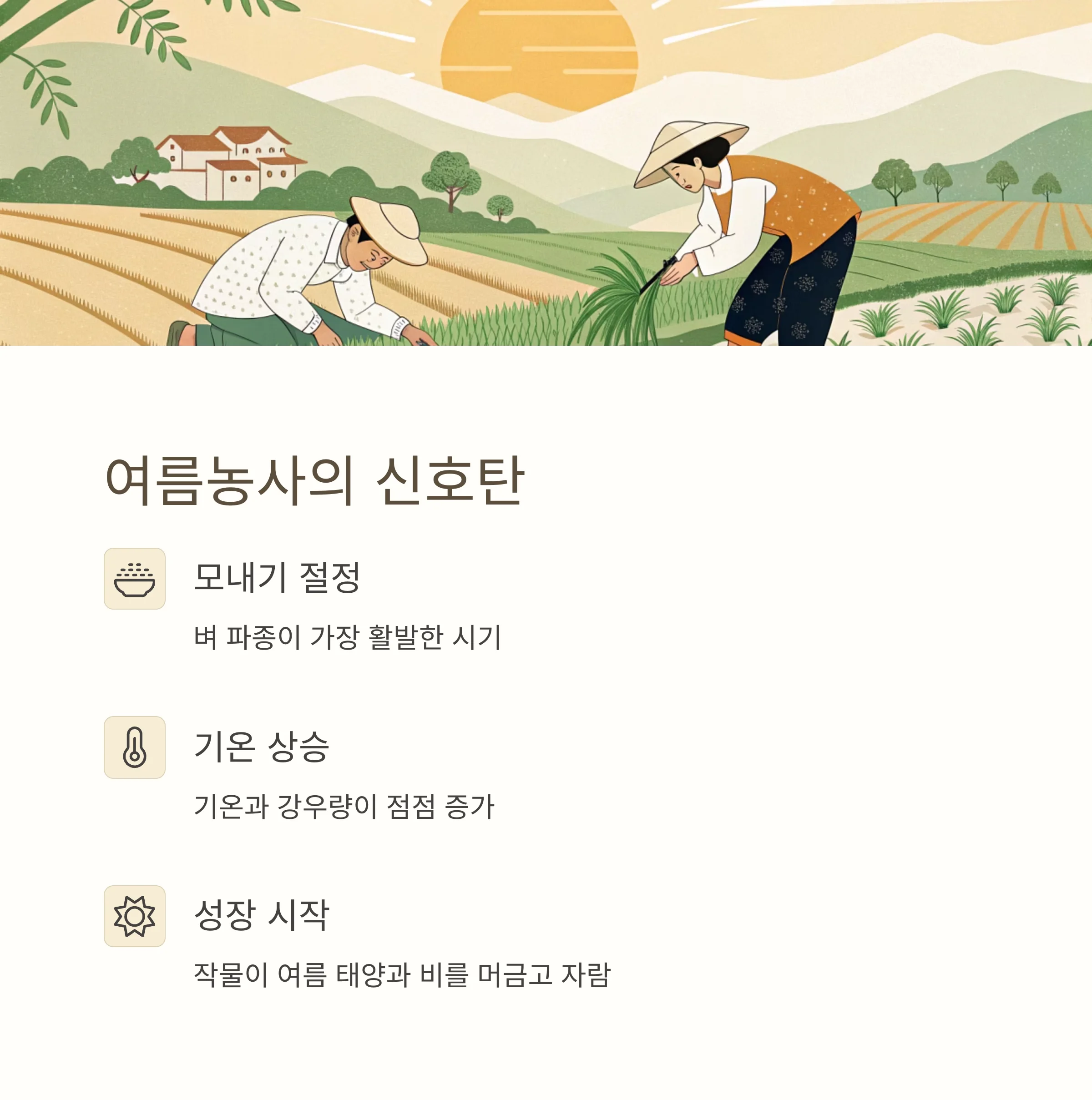 | 주요 농사 | 벼 모내기, 보리·조 파종 등 |