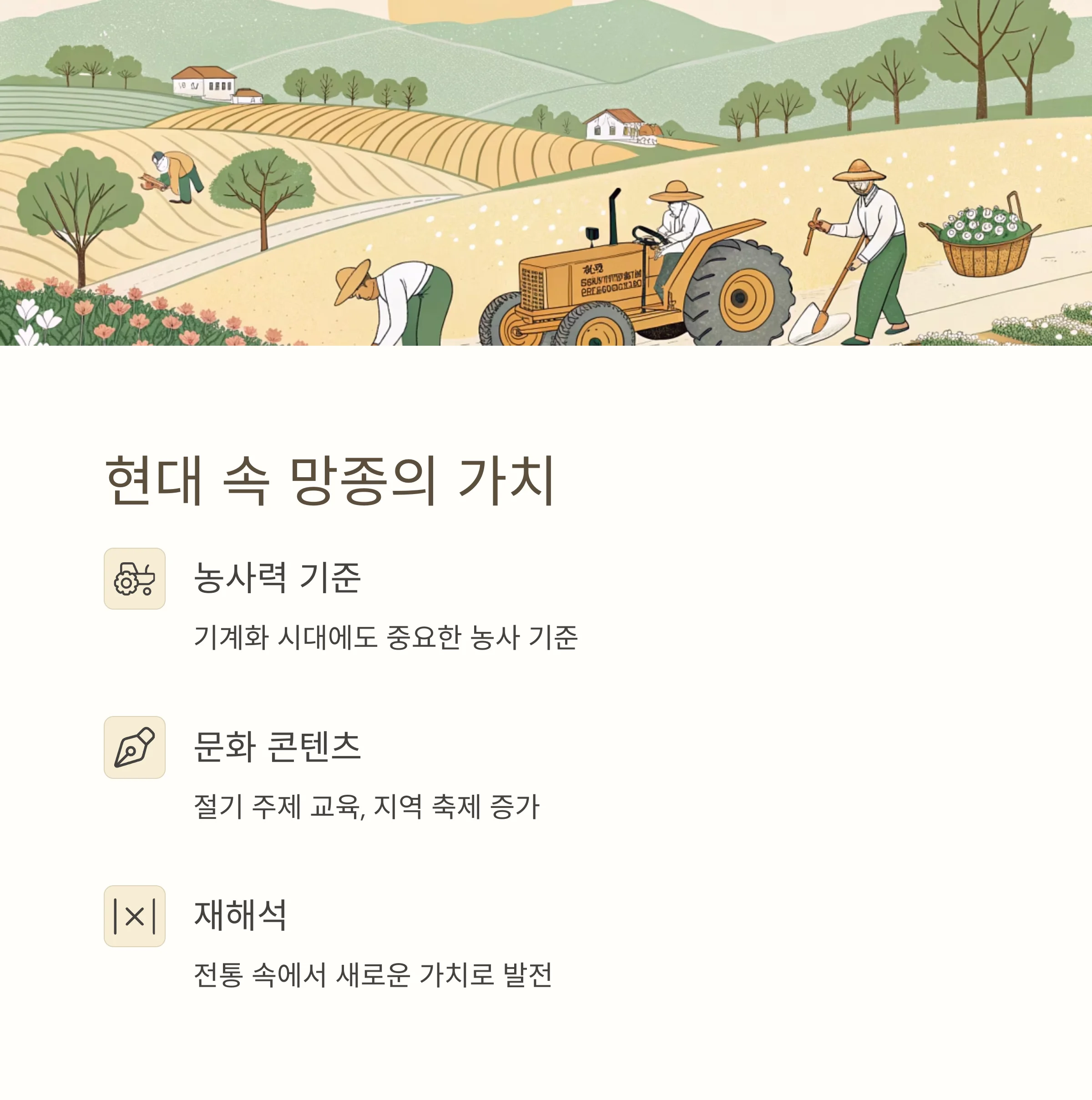 오늘날에는 기계화와 기후 변화로 인해 파종 시기나 방법이 변하고 있지만, 망종은 여전히 농촌에서 중요한 농사력 기준으로 사용되고 있습니다.