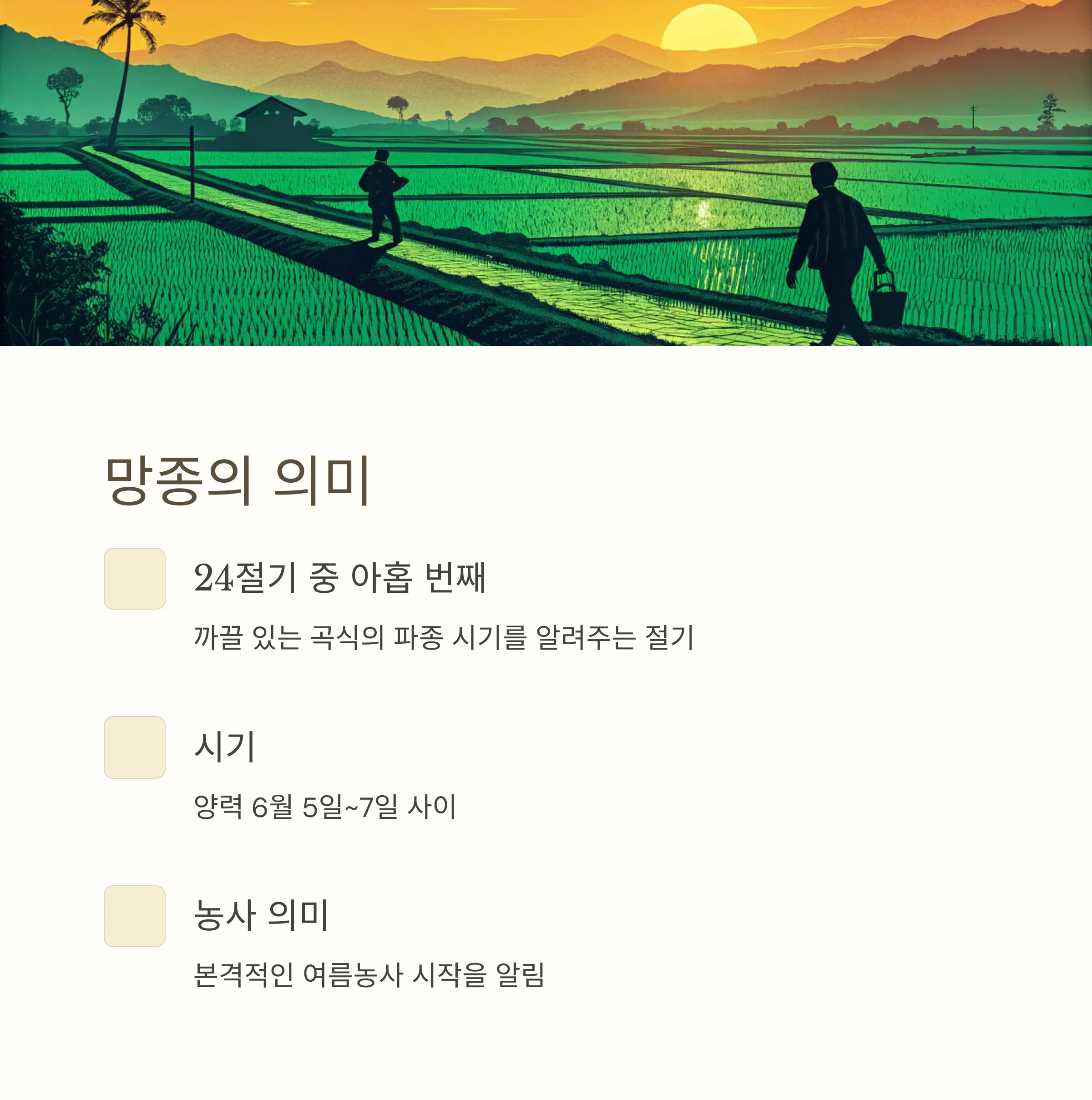 망종(芒種)은 24 절기 중 아홉 번째 절기로, 벼와 같은 까끌 있는 곡식의 파종 시기를 알려주는 시점입니다.