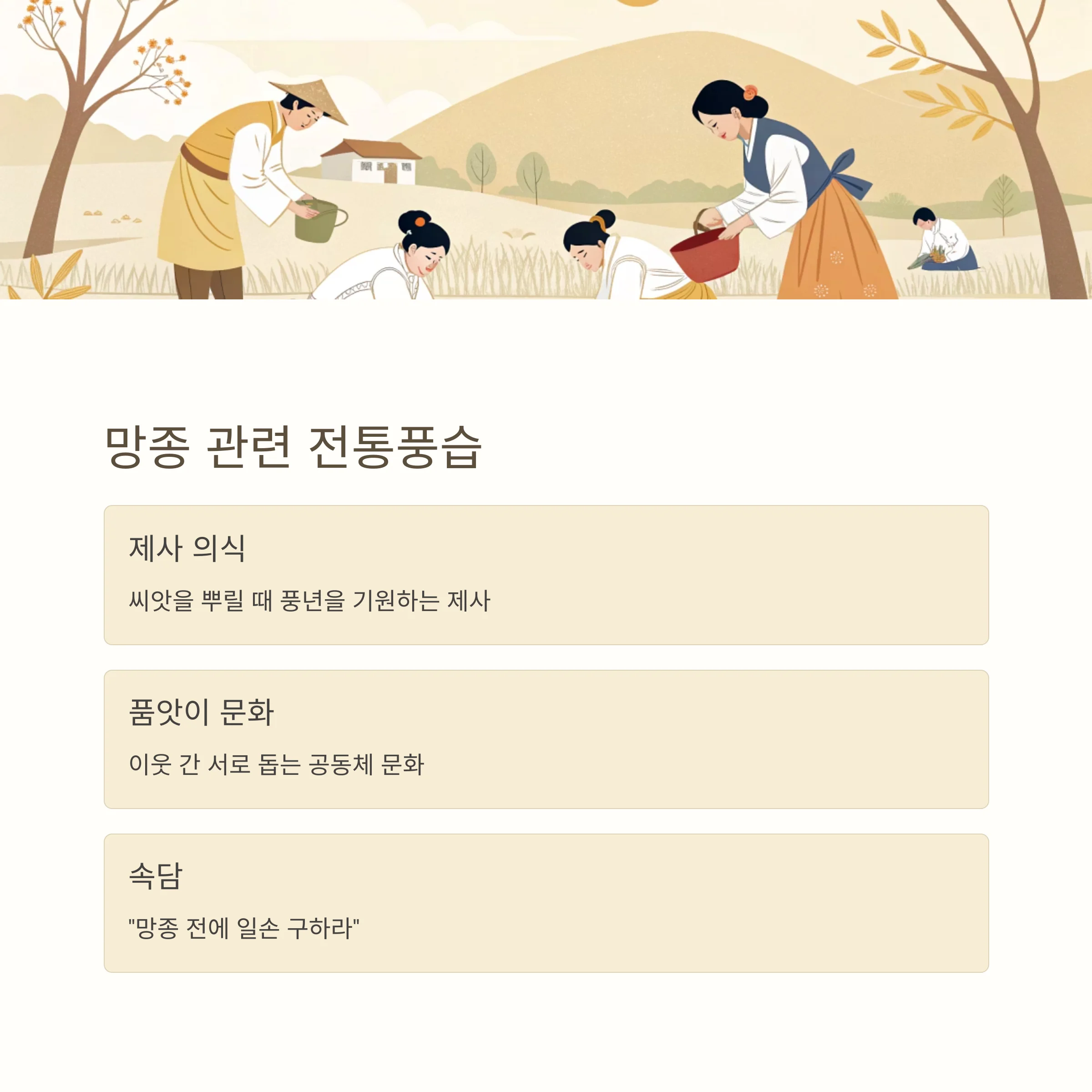 일부 지역에서는 씨앗을 뿌릴 때 풍년을 기원하는 제사를 지내는 풍습이 있었고, 일손이 많아야 하는 시기인 만큼 이웃 간 품앗이 문화도 활발했습니다.