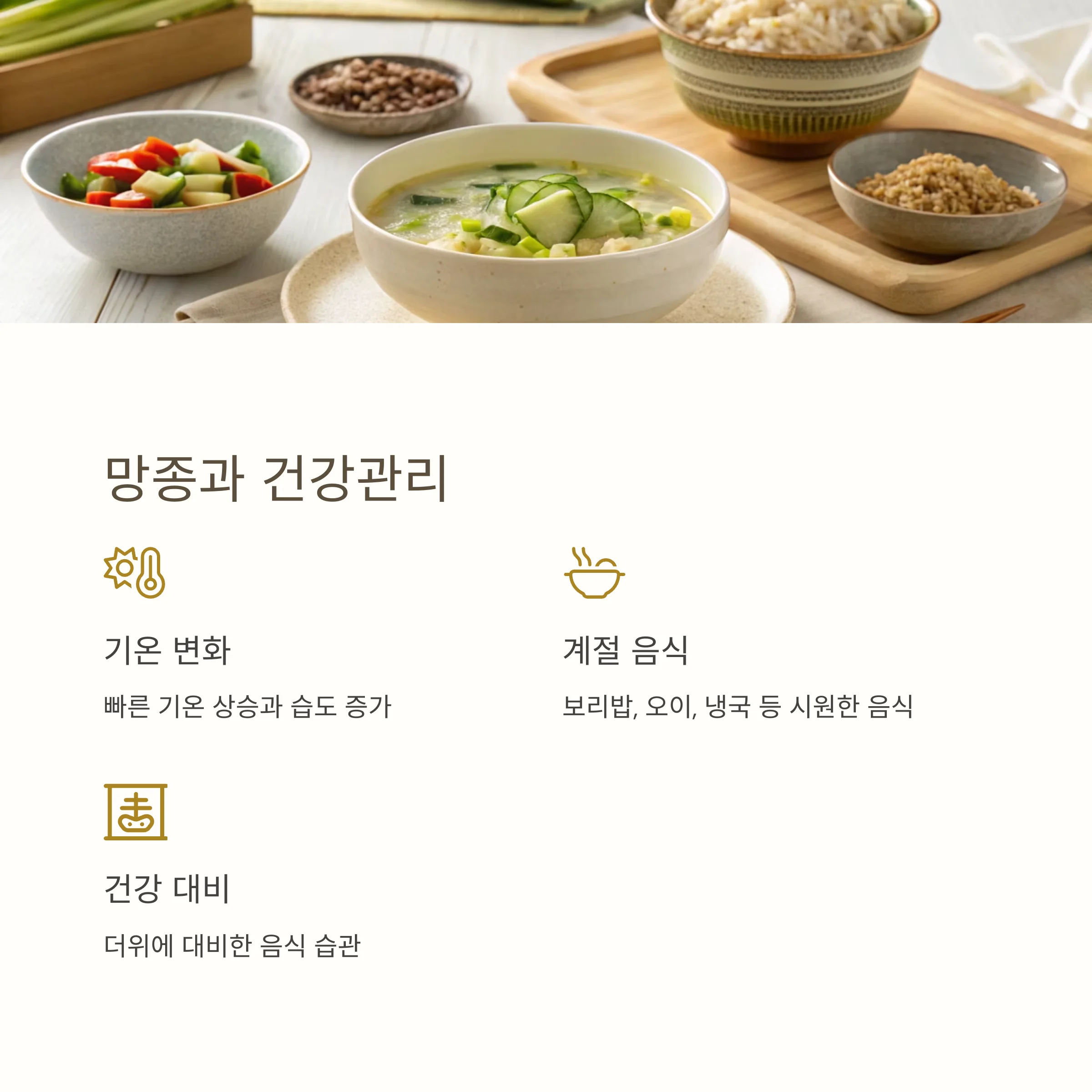 조상들은 이 시기에 보리밥, 오이, 냉국 등 시원하고 소화 잘 되는 음식을 섭취하며, 더위에 대비한 음식 습관도 이미 생활 속에 자리 잡고 있었습니다.