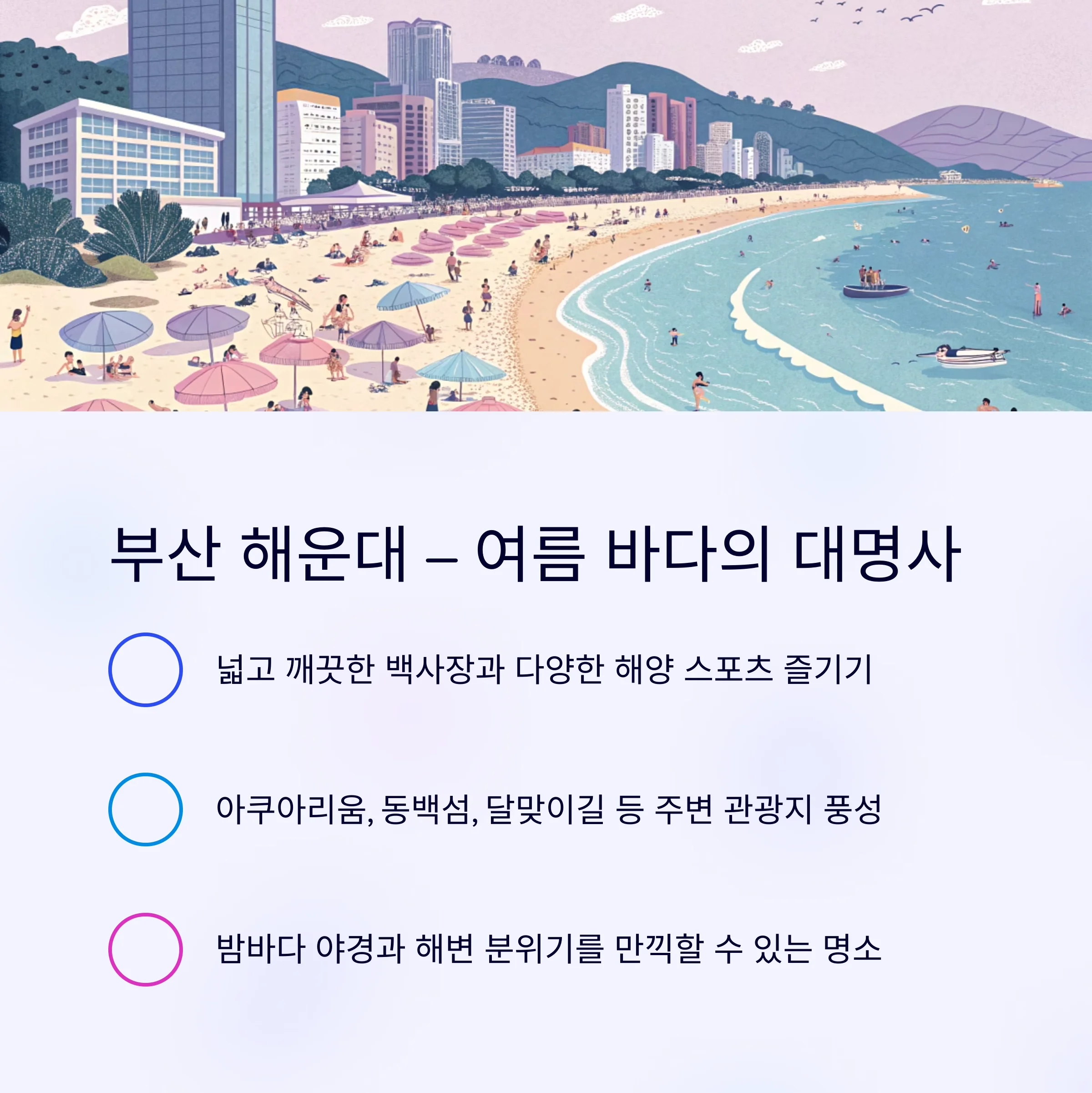 해운대는 여름이면 전국에서 가장 많은 사람들이 찾는 해변 중 하나입니다.