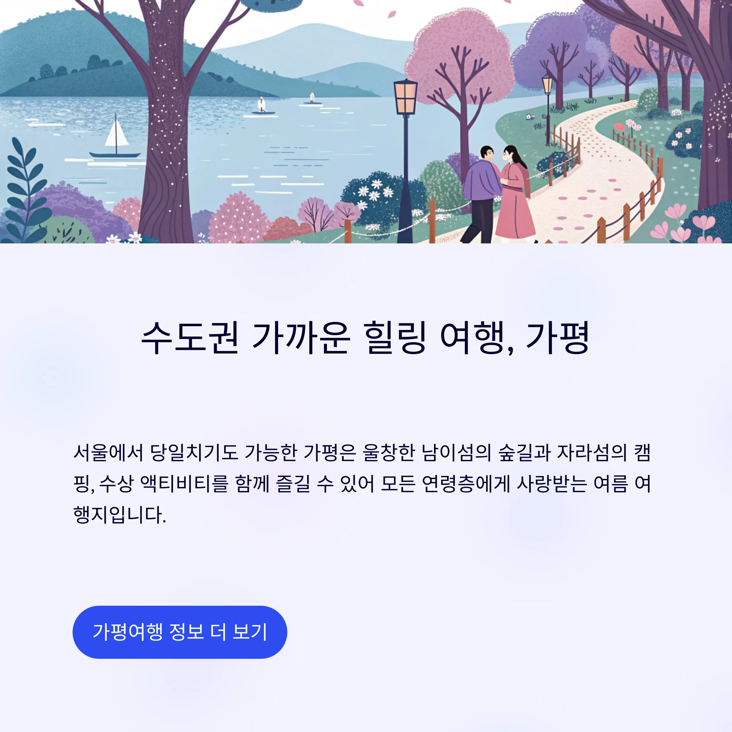 가평은 수도권에서 가까워 당일이나 1박 2일 여행으로 인기 있는 지역입니다.